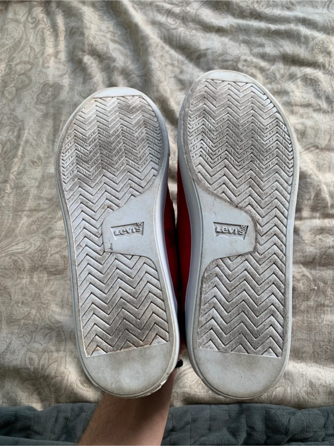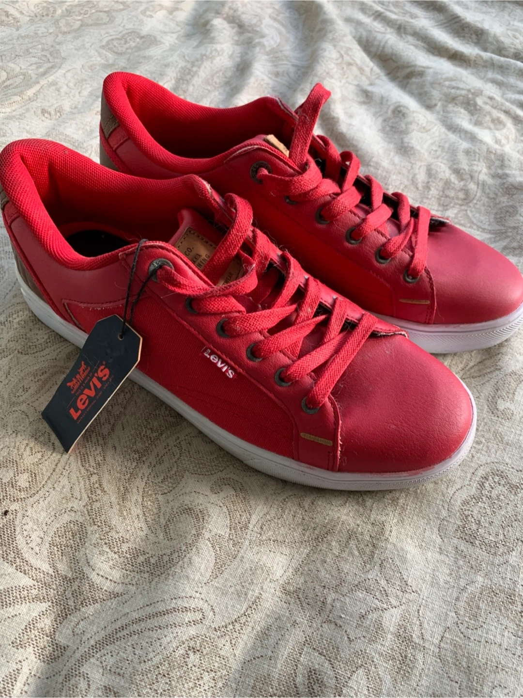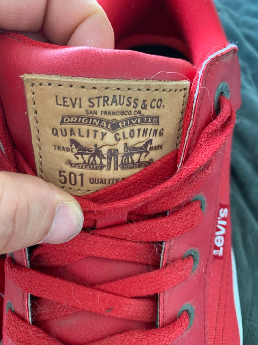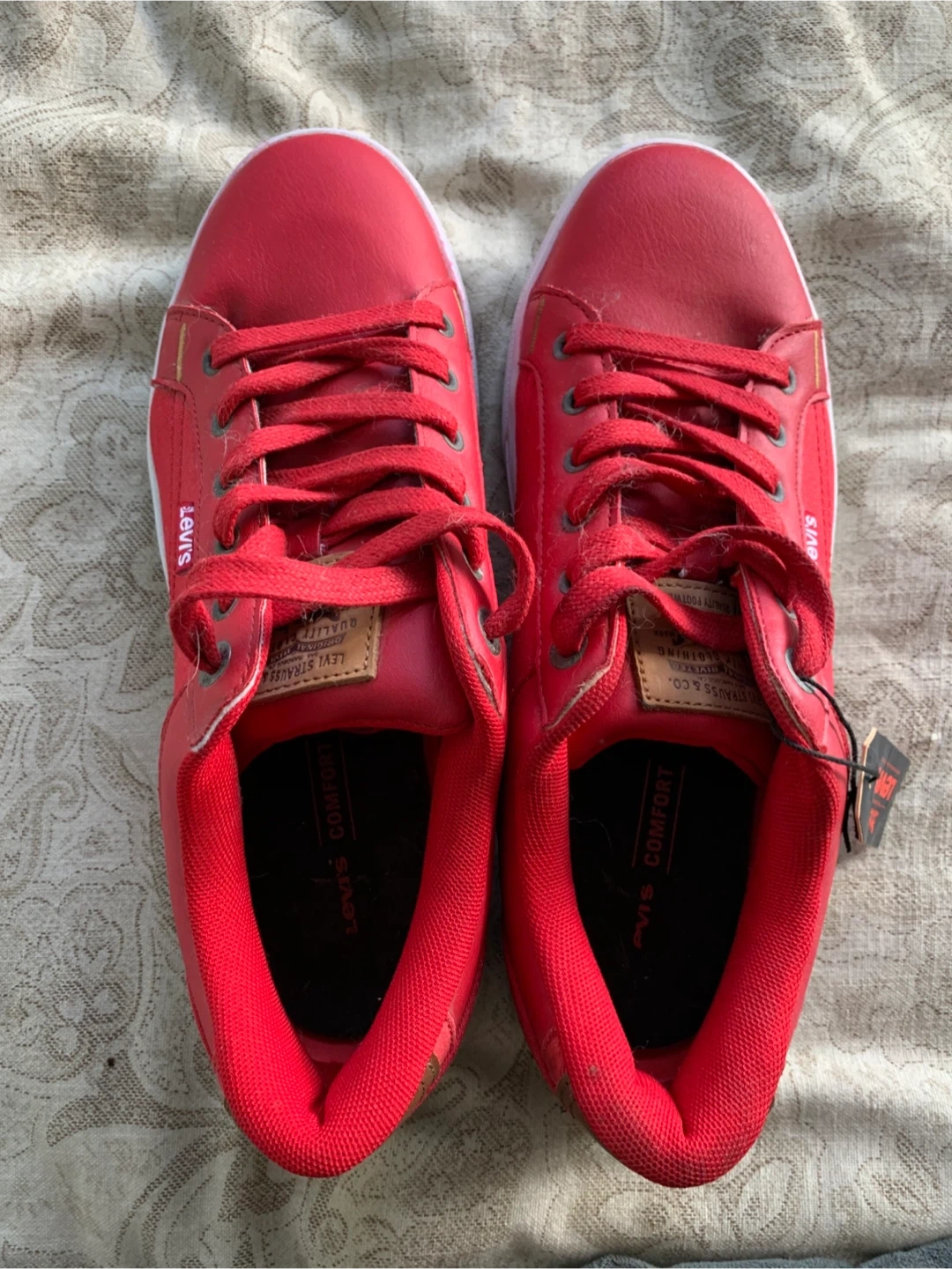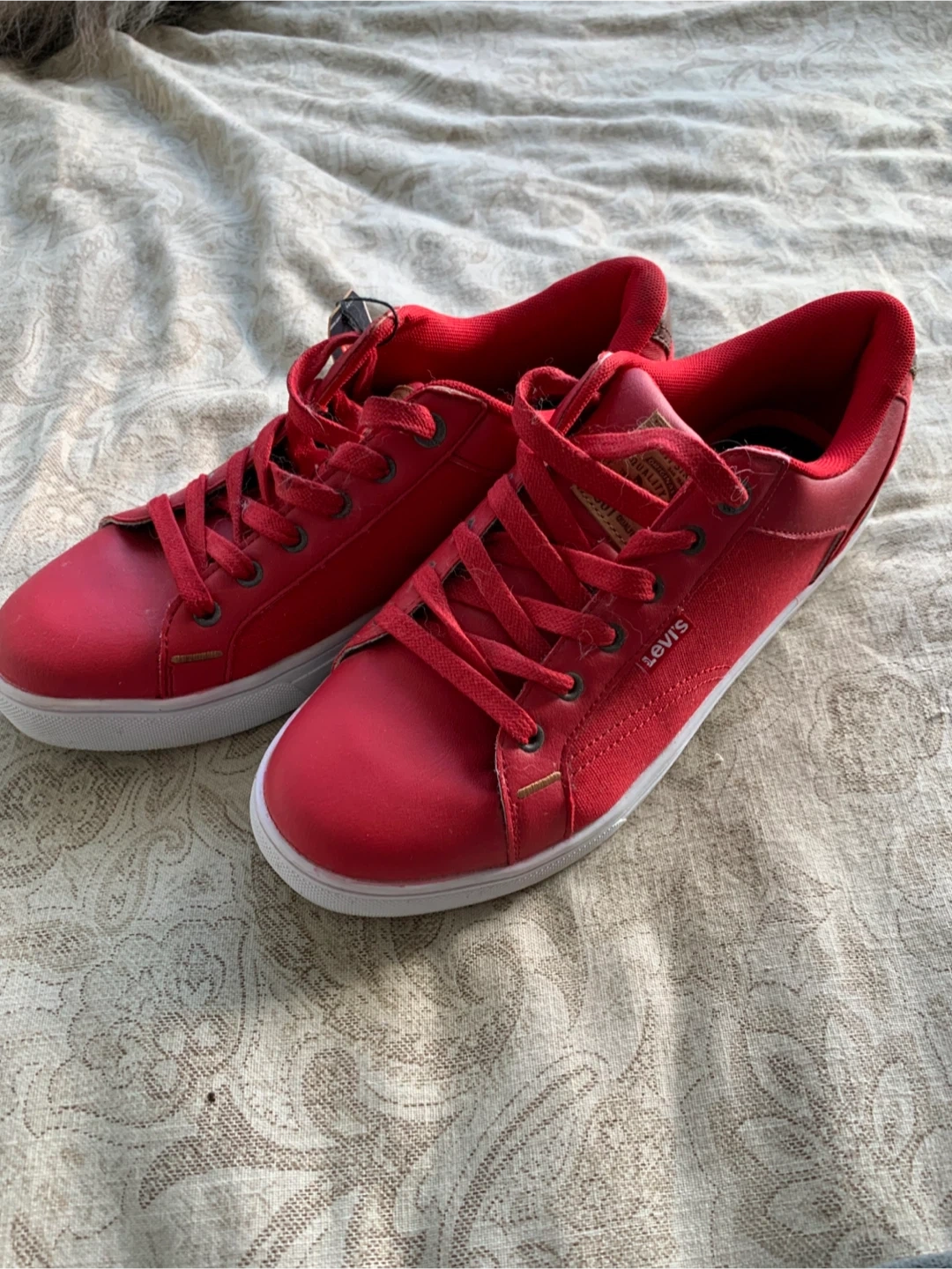Selling a pair of Levi's sneakers in red. They show some signs of wear on the soles, but the uppers are in good condition. The shoes feature the classic Levi Strauss & Co. logo on the tongue and the Levi's name on the side
