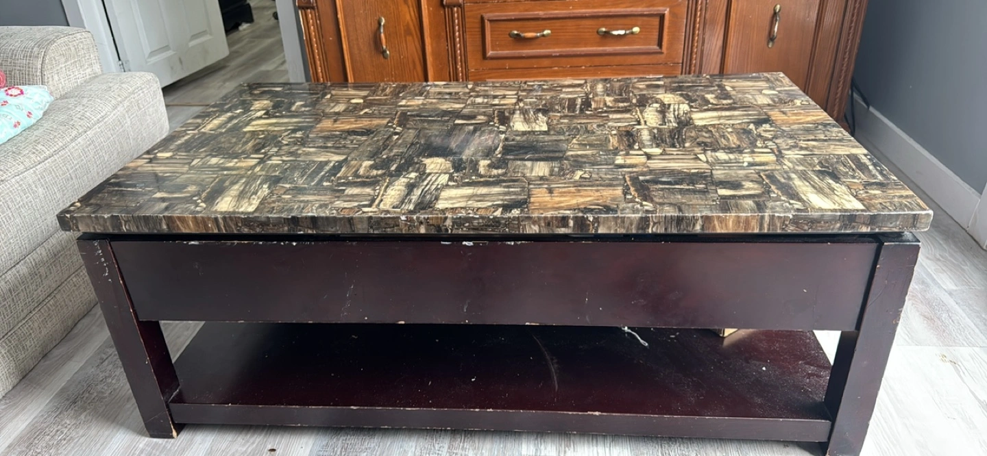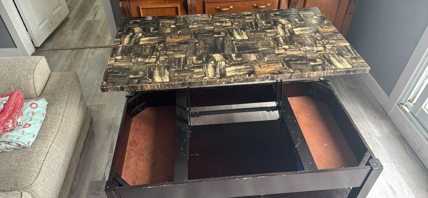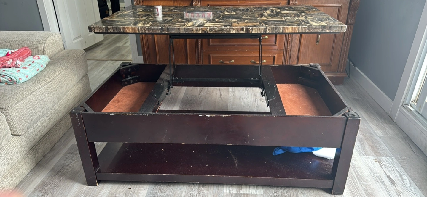 Dark brown lift-top coffee table. Features a marble-look top and a lower shelf. Provides extra storage space. Good condition.