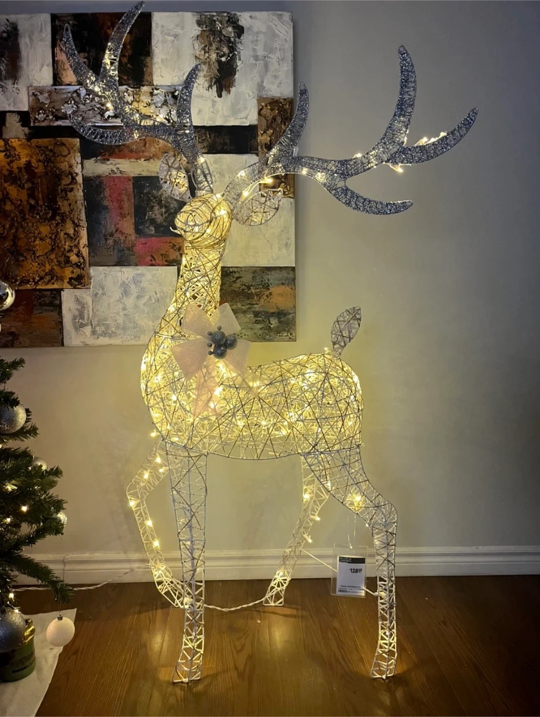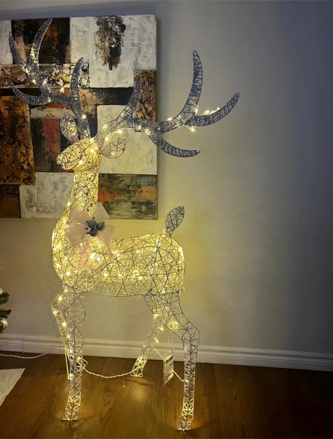 Brand new large, silver, wire reindeer with built-in LED lights. Still has the tag on it. Stands on a flat base. Perfect for adding a festive touch to your holiday decor.