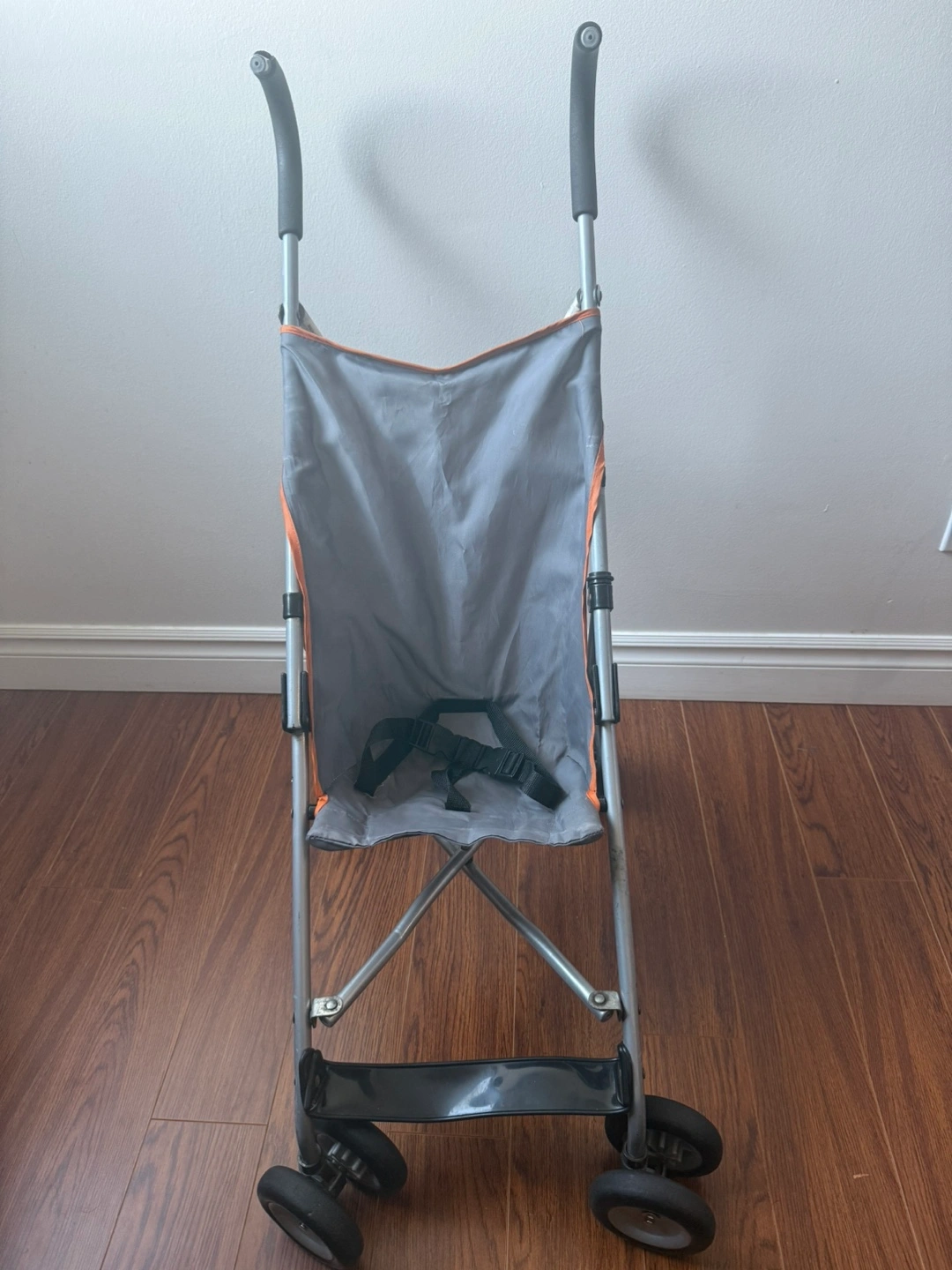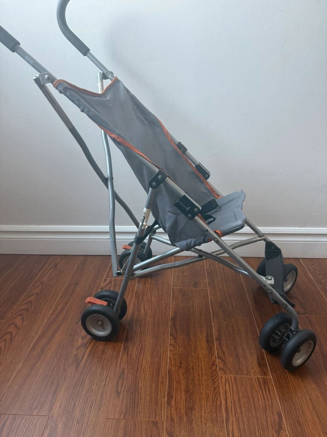 Compact foldable stroller. Grey fabric with orange accents. Suitable for travel. Small wheels. Lightweight aluminium frame.