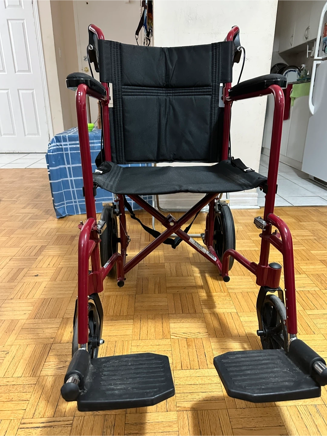 Lightweight and easy to use, this manual wheelchair is in good condition. Comfortable seat with sturdy frame, smooth-rolling wheels, and foldable design for easy storage and transport. Ideal for everyday use at home or outdoors.