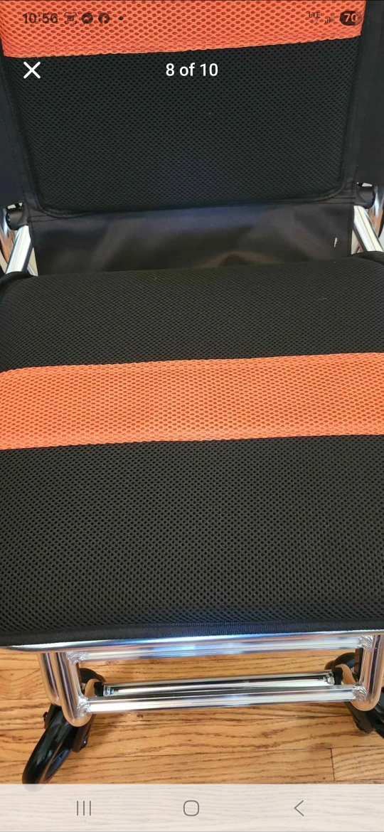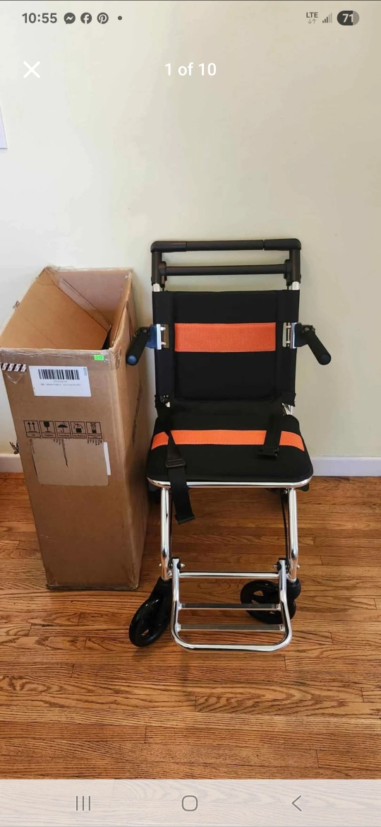 Selling a lightweight transport wheelchair! It's brand new with the original box. Perfect for easy transport and storage. The wheelchair features a black and orange design and is easy to maneuver. Don't miss out!