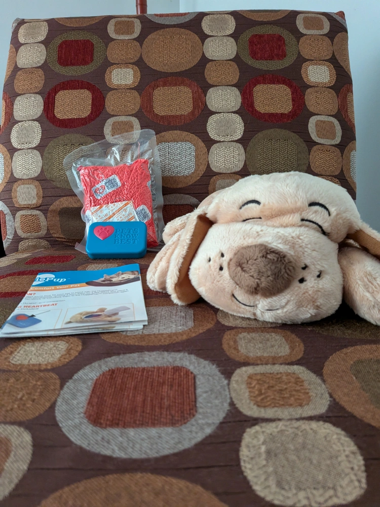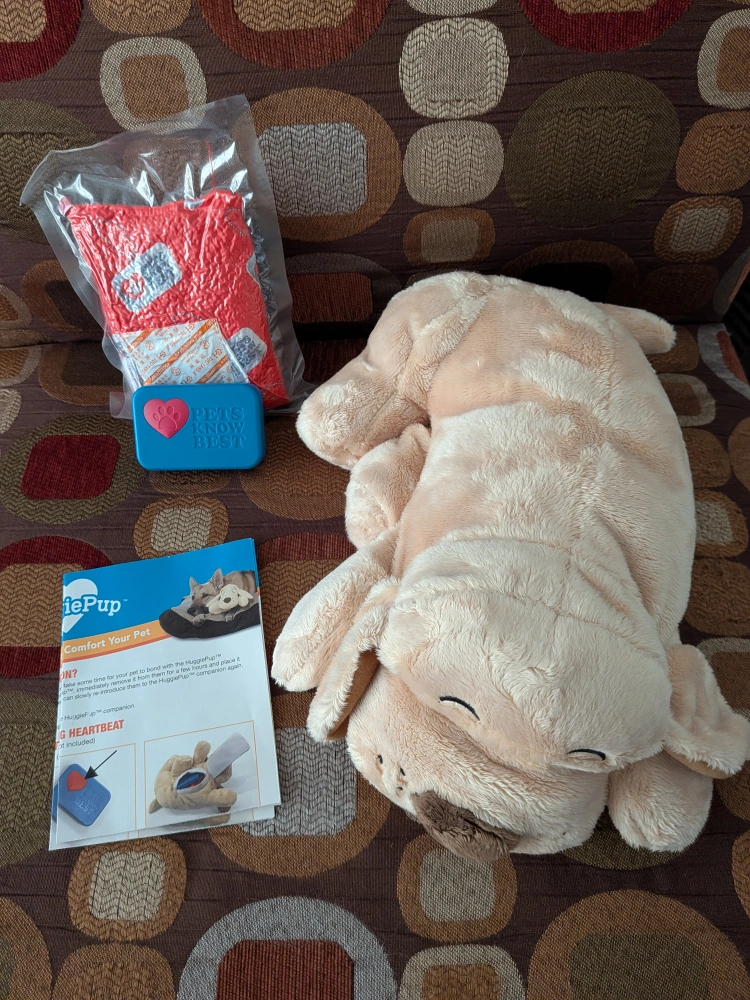 Selling a 'like new' HuggiePup, the perfect comfort pet for your furry friend! This plush toy is designed to help soothe anxious pets with its comforting heartbeat feature. It comes with everything included that was in the original packaging, so your pet can enjoy a sense of security and relaxation right away! I bought it for my dog when I got him last year, but he didn't seem to need it as he just curled up with me, and found comfort in sleeping right next to me. It is pretty much brand new, other than attempting to give it to my dog a few times, which he never took to.