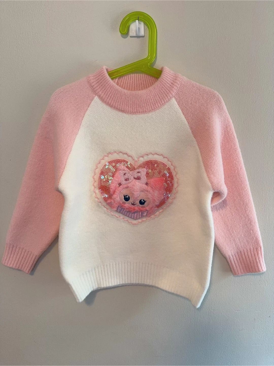 A super cute Lingna Belle sweater for your little one! It's in great shape and features Lingna Belle’s sweet face in a sequined heart. The sweater is pink and white, perfect for adding a touch of charm to any outfit
