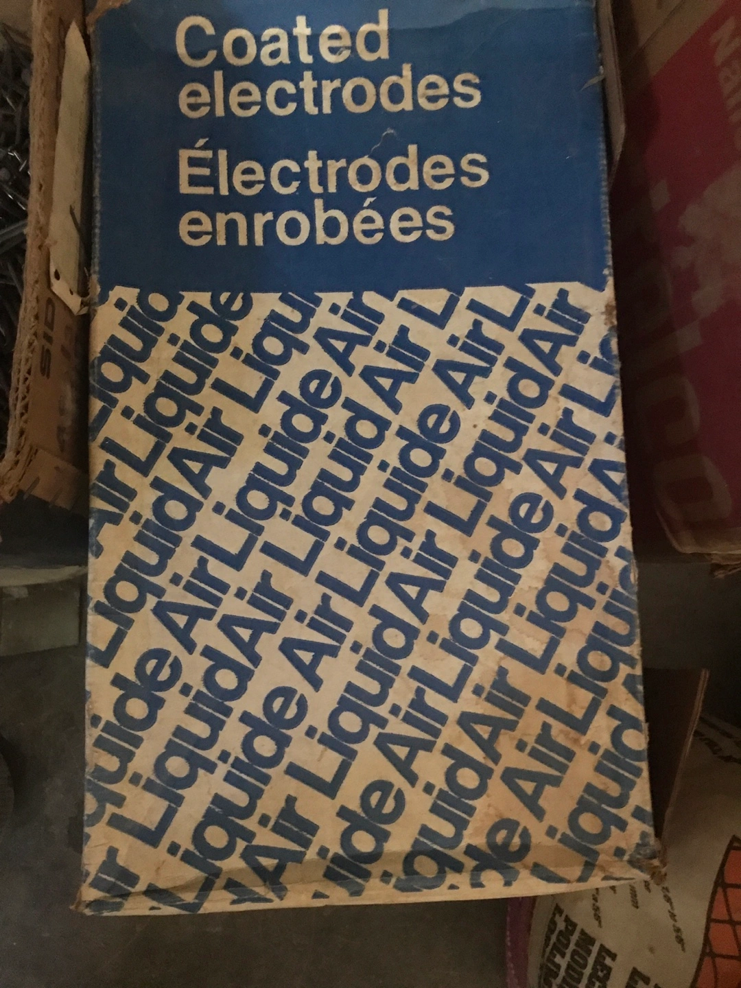 Selling a box of coated electrodes by Liquid Air. The box has some wear, but the contents are presumed to be in good condition. Text on the box includes 'Coated electrodes' and 'Électrodes enrobées'.