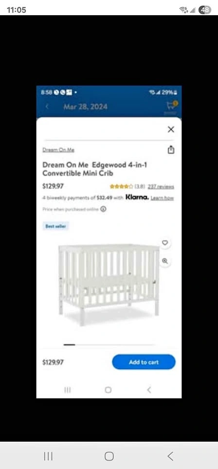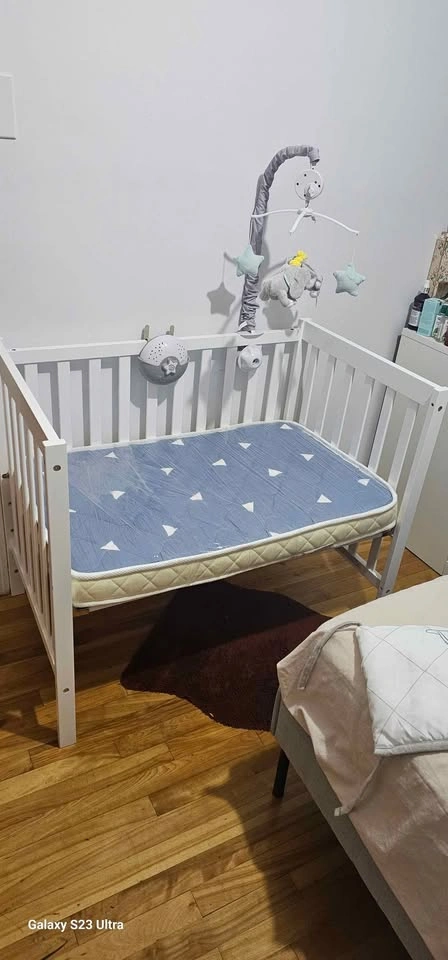 In excellent condition, used for only a few months. The mattress is new and very clean. Suitable for small spaces. Dimensions: 39" × 28". Adjustable to 3 positions, and you can use it on the mother's side without the 4th side, as shown in the photo.