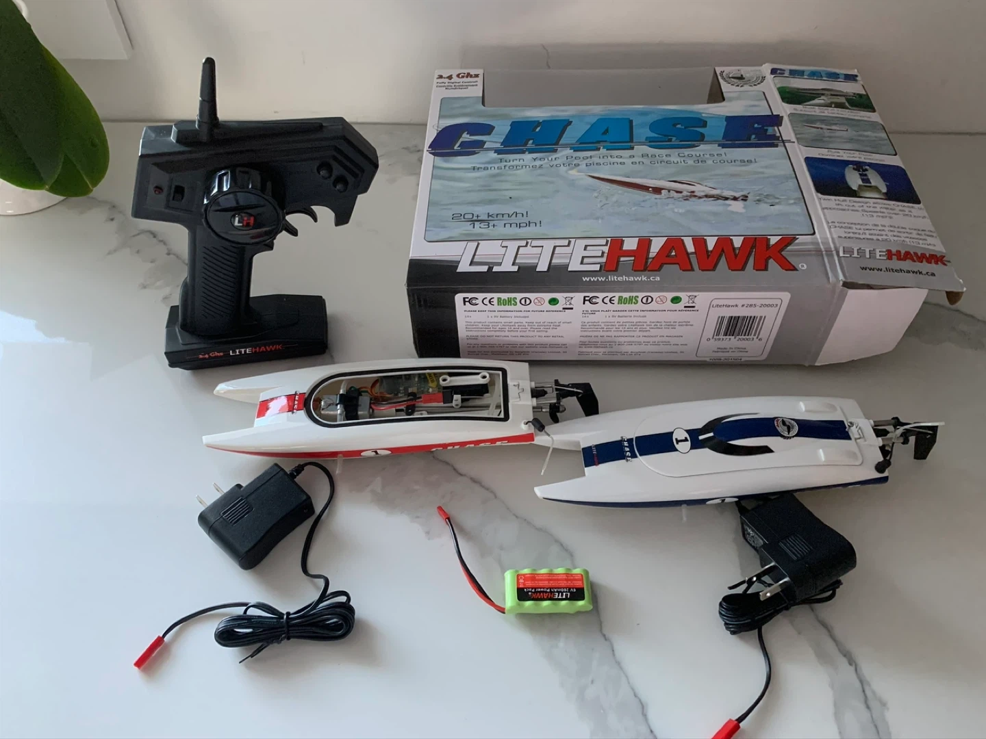 For parts One works LiteHawk Chase RC boat! It can reach speeds of 20+ km/h (13+ mph). Includes the remote control, battery, and charger. The box is also included!