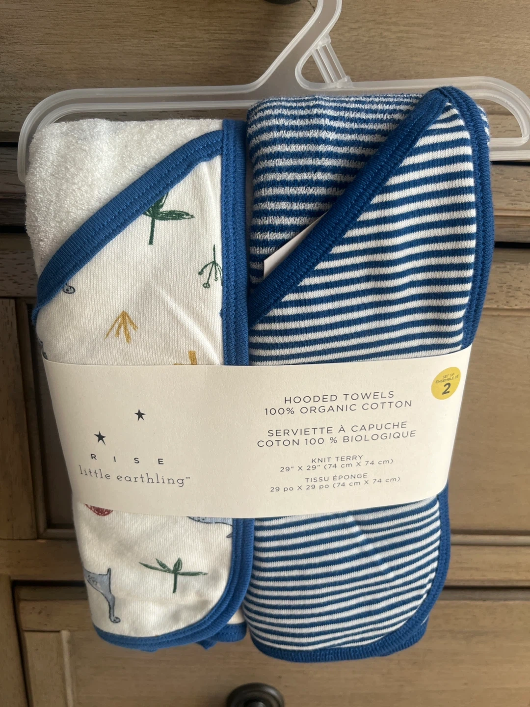 Keep your little one cozy after bath time with this adorable set of two hooded towels from Little Earthling! Made with 100% organic cotton, these towels are soft and gentle on delicate skin. Each towel measures 29" x 29" (74cm x 74cm). One towel features a cute print, while the other has a classic blue and white striped design