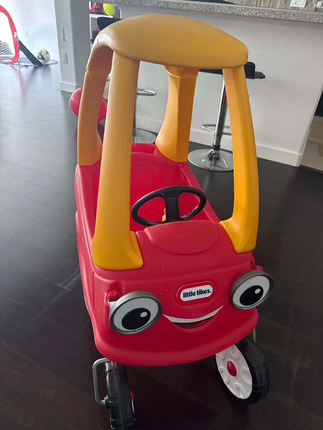 The classic Little Tikes Cozy Coupe is ready for a new home! This foot-to-floor ride-on is perfect for toddlers and young children. It features a working door, a steering wheel with a horn, and rugged, durable tires. Great for indoor or outdoor play!