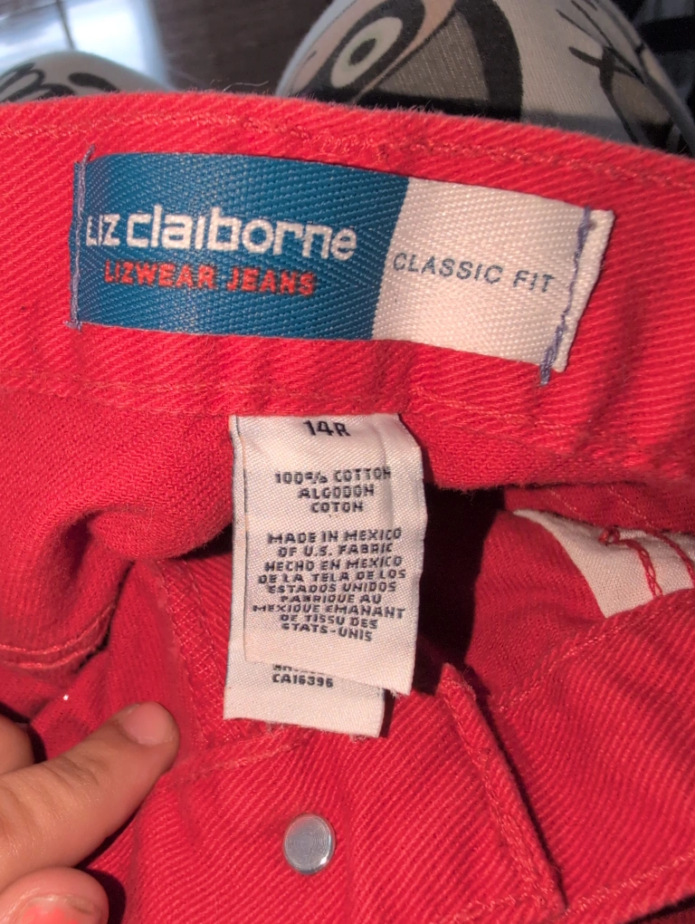 Selling a pair of Liz Claiborne Lizwear Jeans in a vibrant red! These are a classic fit and size 14R. They're made of 100% cotton for a comfy feel.