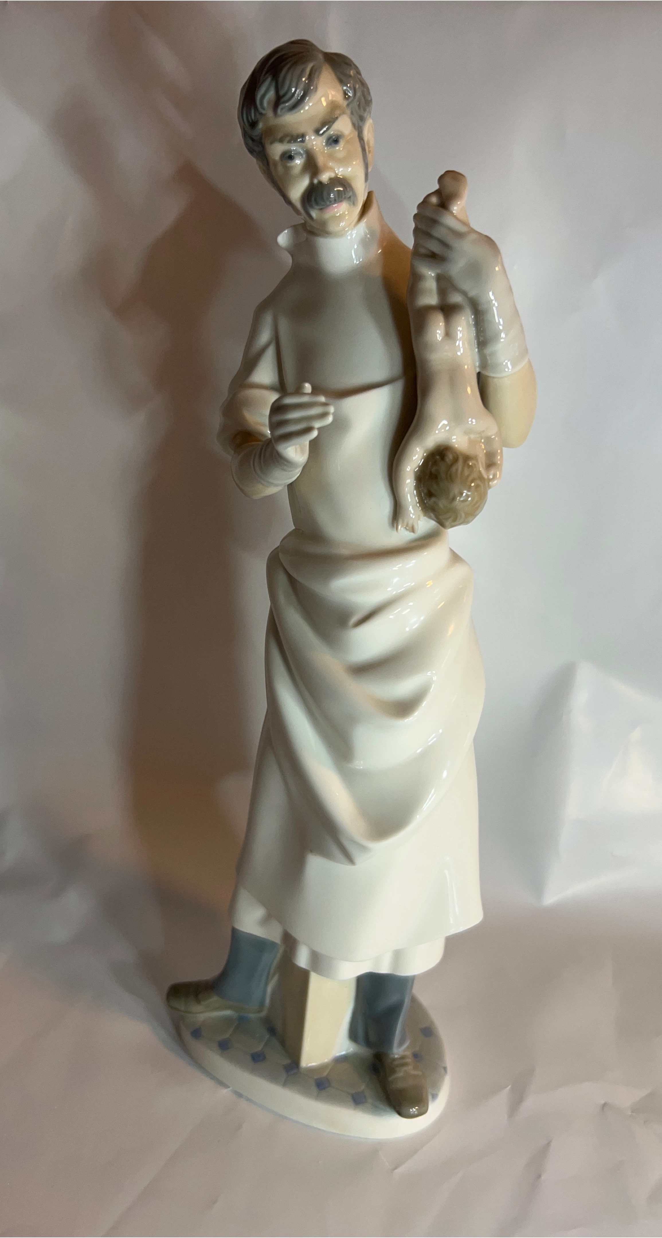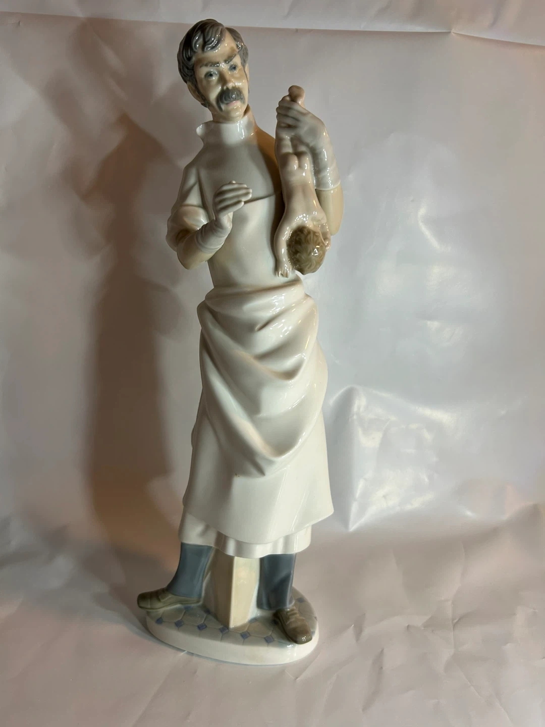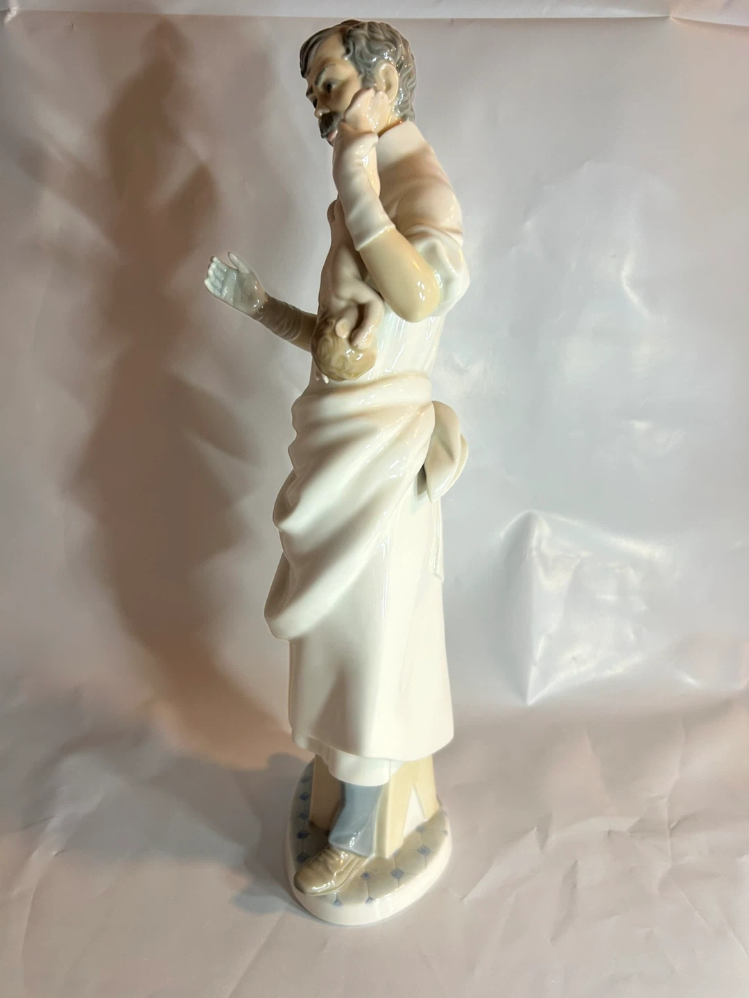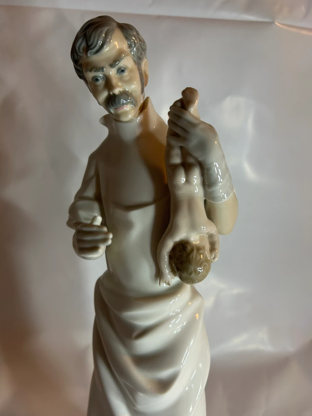 This is a Lladro figurine of a doctor holding a newborn baby. It's in great condition and would be a lovely addition to any collection or nursery!