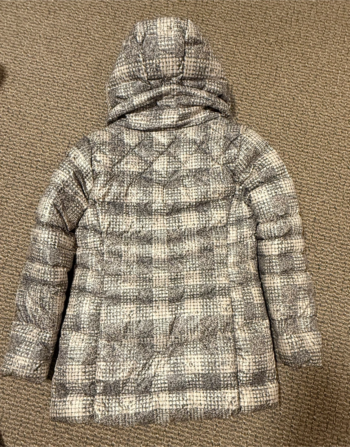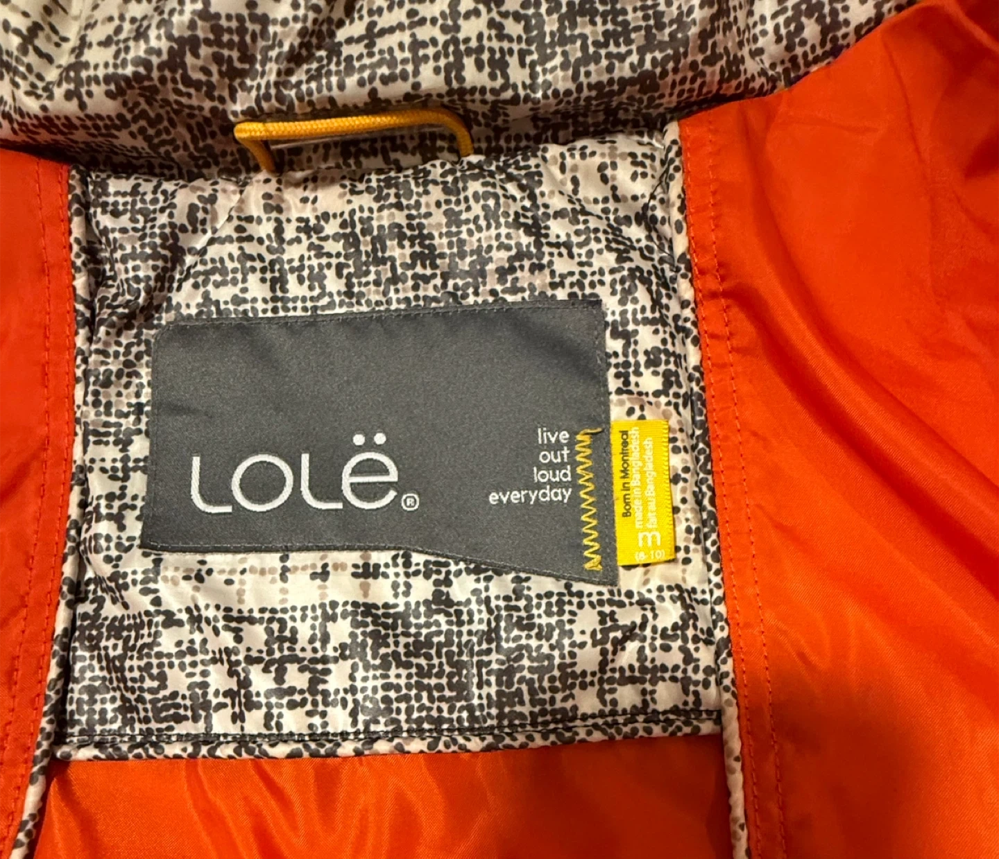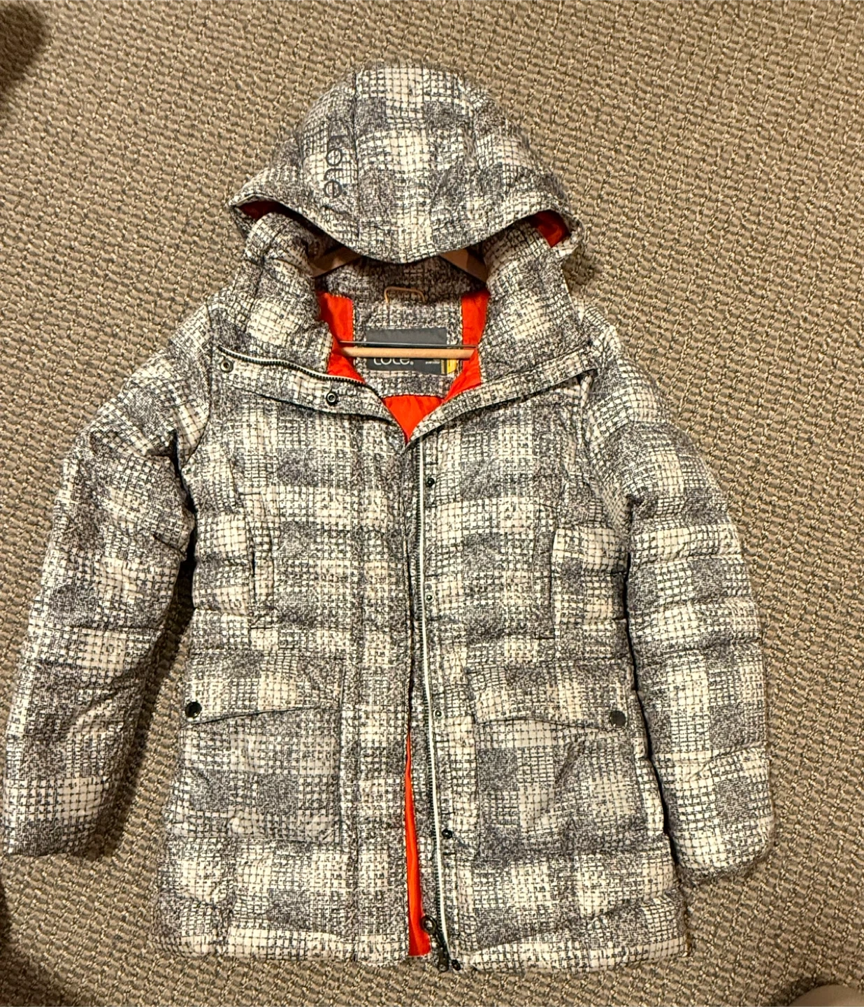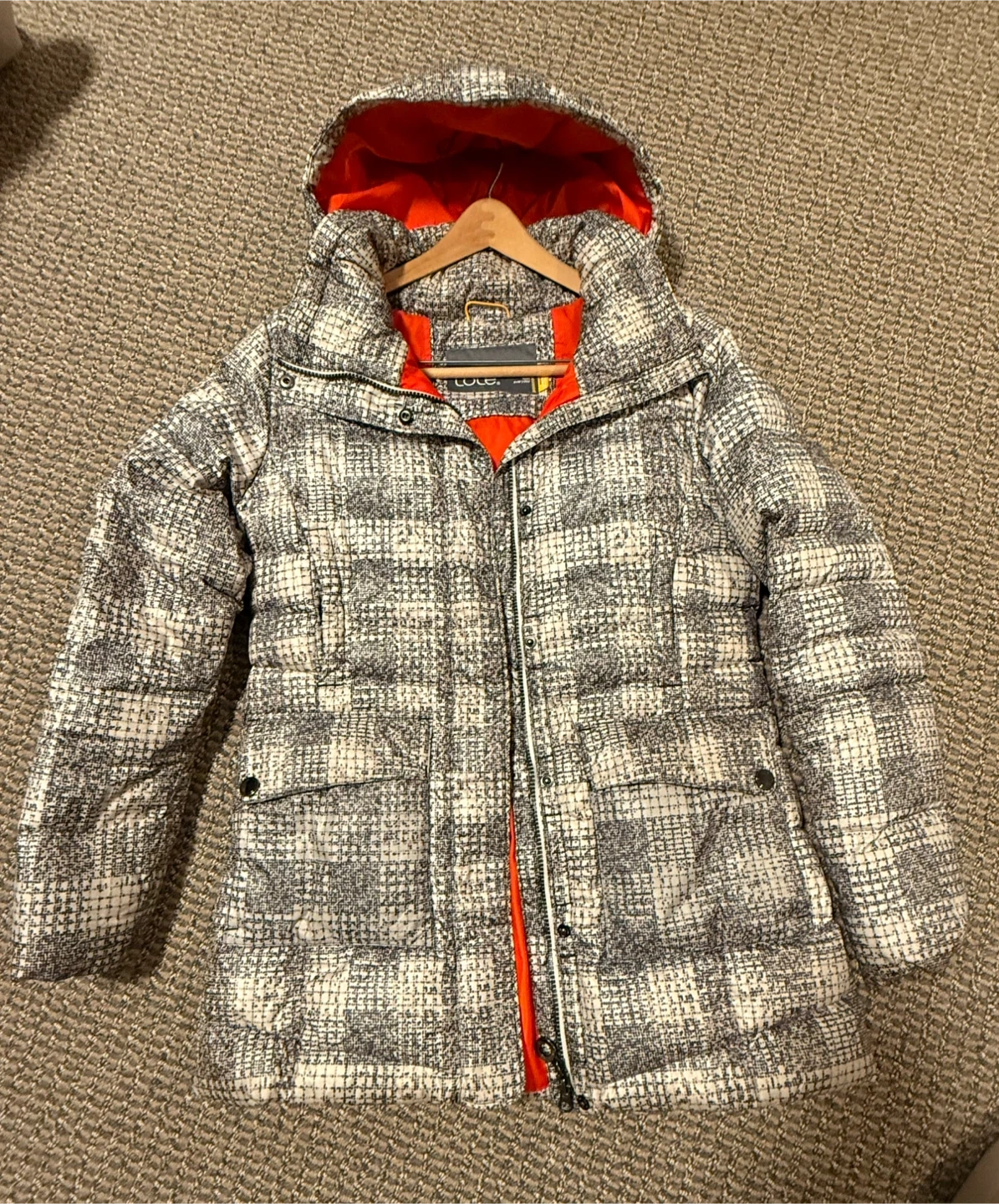 Selling a Lolë women's puffer jacket. It features a stylish plaid pattern and a bright orange lining. It's perfect for staying warm during the colder months!