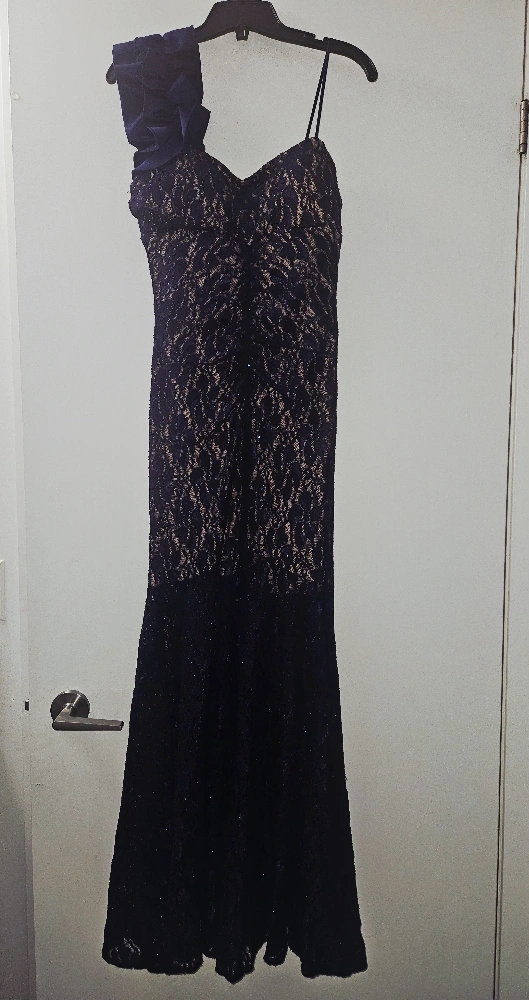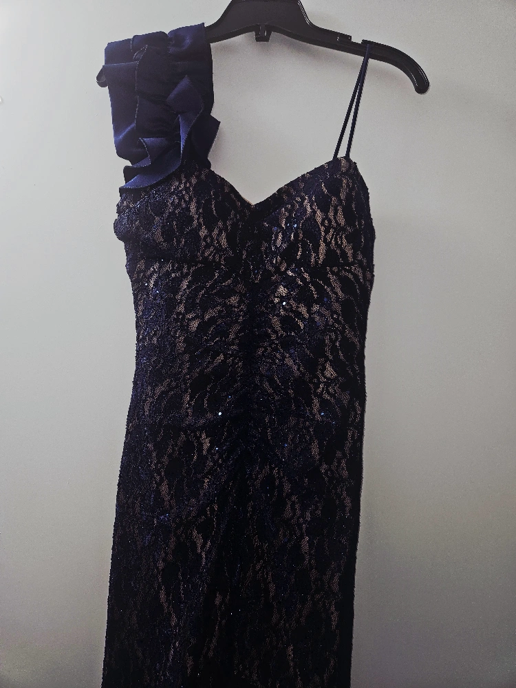 Selling a beautiful, long, navy blue lace formal dress. It features a stylish bow detail on one shoulder and a flattering silhouette. Perfect for a special occasion!