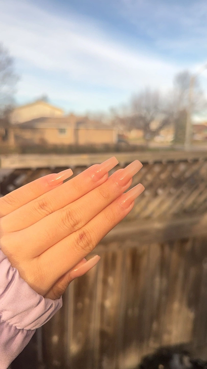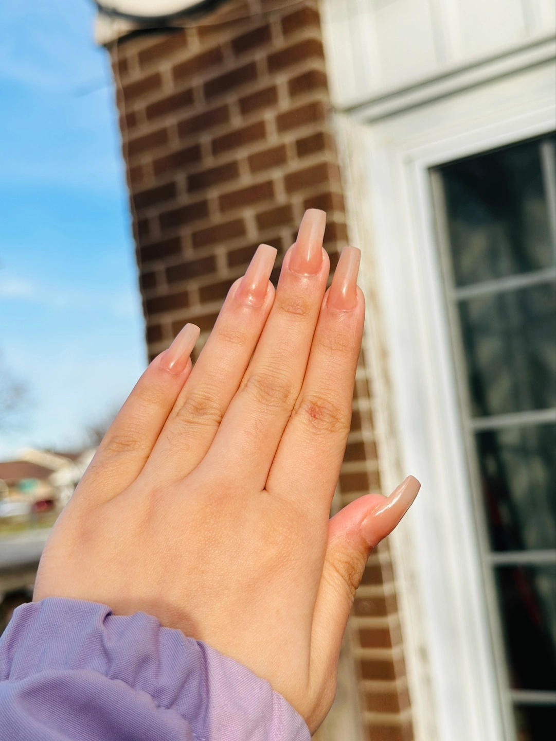 Set of false nails. Beige colour. Square shape. Long length. Perfect for a natural look.