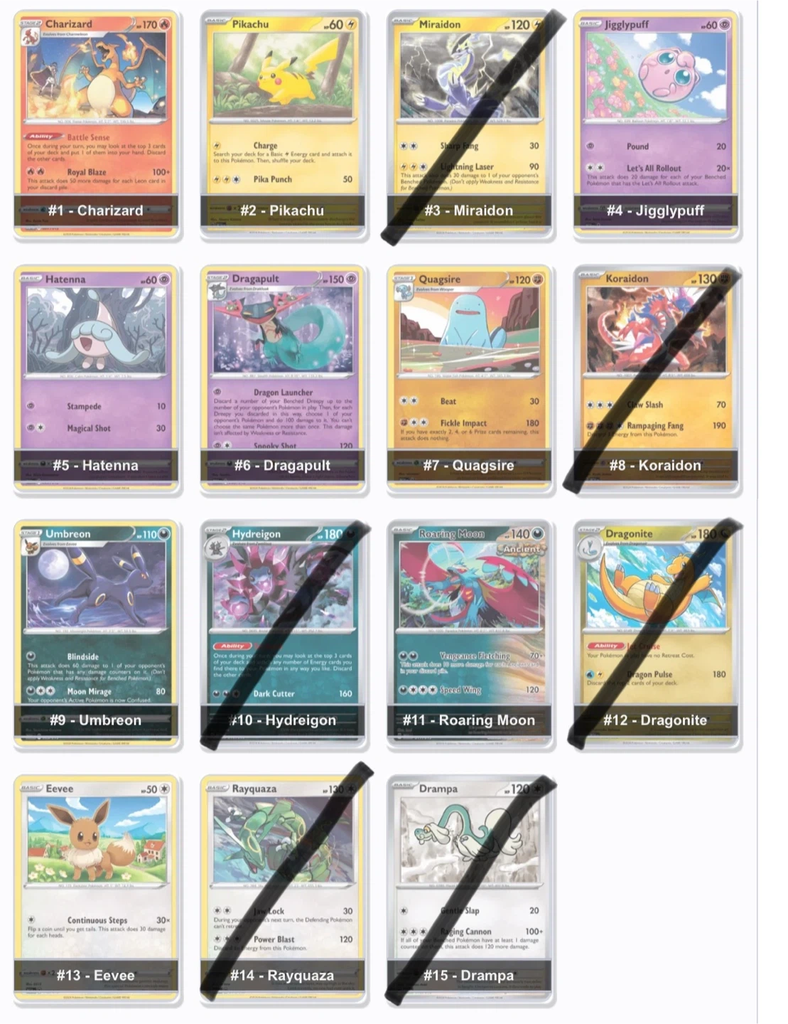 I’m looking for these Pokemon Cards from the McDonald’s 2024/2025 Dragon Discovery Set. I’m looking to buy these cards at these preferred prices (for NM condition). Available to meet up at Metrotown or Burnaby SFU. Buying Prices (Higher than TCGPlayer Market Price): Charizard 1/15 $2 Pikachu 2/15 $3 Jigglypuff 4/15 $0.5 Hatenna 5/15 $0.5 Dragapult 6/15 $0.5 Quaqsire 7/15 $0.5 Umbreon 9/15 $0.5 Roaring Moon 11/15 $3 Eevee 13/15 $0.5 Buying Price for all cards: $12