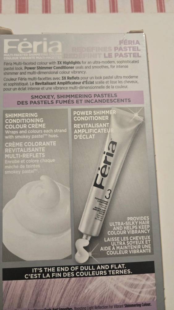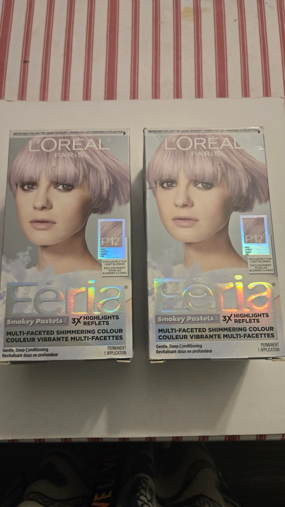 Selling two boxes of L'Oreal Feria Smokey Pastels hair dye in P12. This multi-faceted shimmering colour is designed to give your hair a vibrant, multi-dimensional look. It's formulated with 3X Highlights for an ultra-modern pastel look. Perfect for light blonde or lighter hair! each 5$