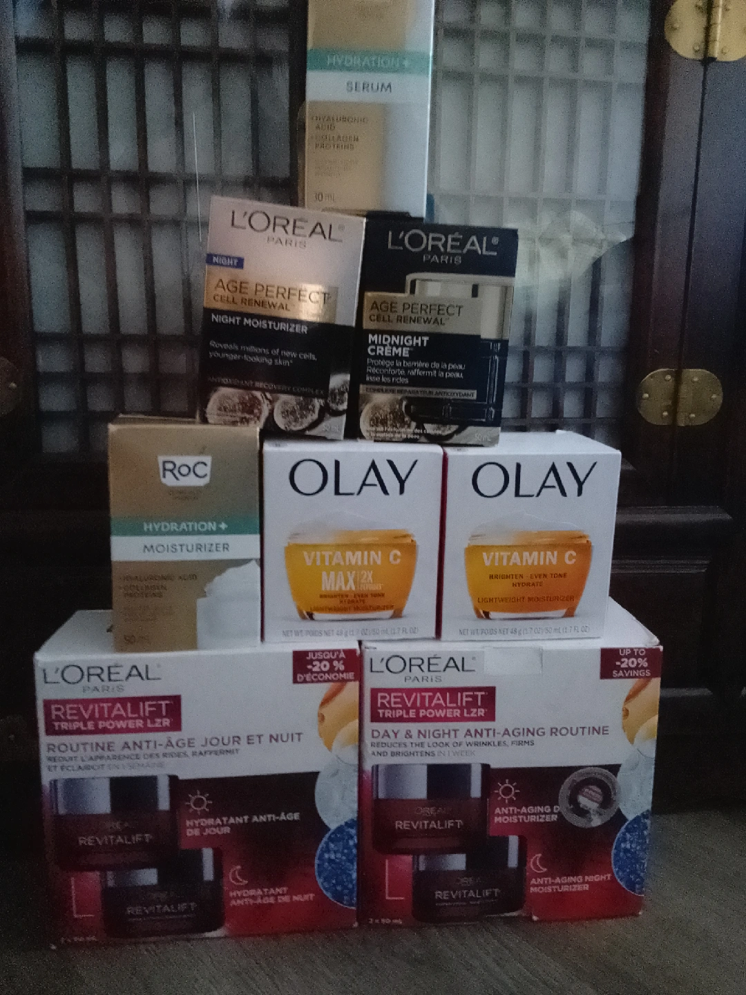 Selling a skincare lot that includes L'Oreal, Olay, and Roc products. Included: - L'Oreal Age Perfect Cell Renewal Night Moisturizer - L'Oreal Age Perfect Cell Renewal Midnight Creme - Roc Hydration + Moisturizer - Olay Vitamin C MAX 2X - Olay Vitamin C Lightweight Moisturizer - L'Oreal Revitalift Triple Power LZR Routine Anti-Age Jour et Nuit - L'Oreal Revitalift Triple Power LZR Day & Night Anti-Aging Routine