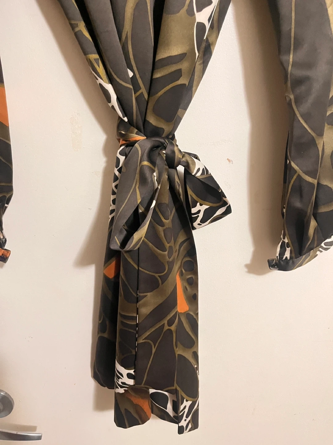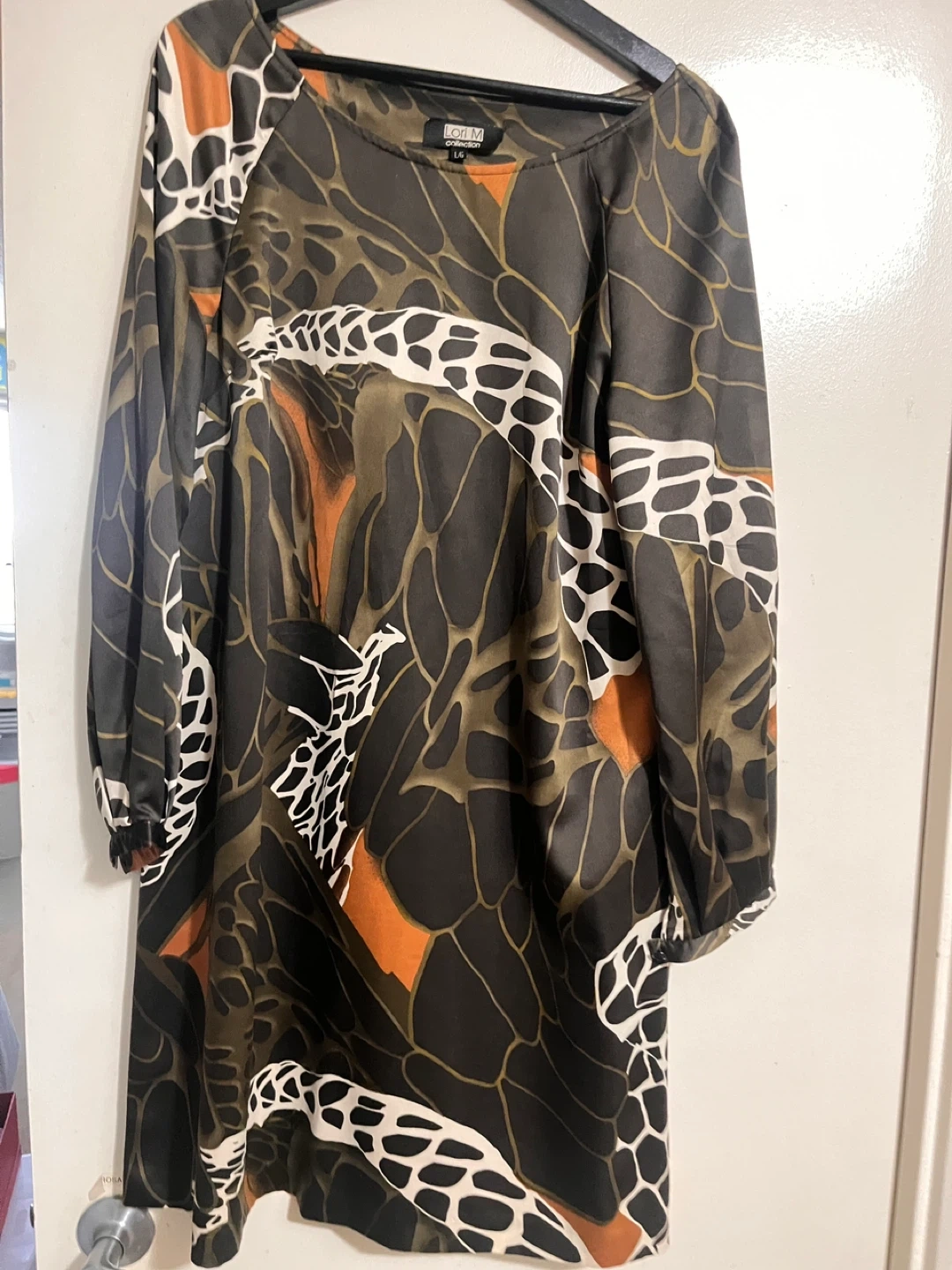 Selling a Lori M Collection dress in size L/G. The dress features a unique pattern with colours of brown, orange, and white. It also comes with a matching tie!