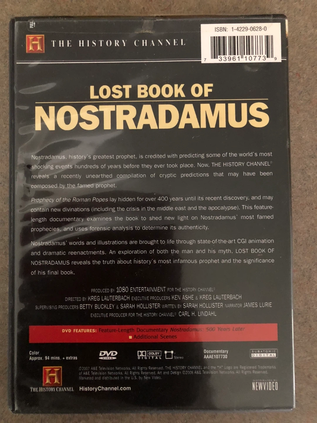 The History Channel's Lost Book of Nostradamus on DVD! This feature-length documentary examines the book to shed new light on Nostradamus' most famed prophecies, and uses forensic analysis to determine its authenticity. Approx. 94 mins. + extras