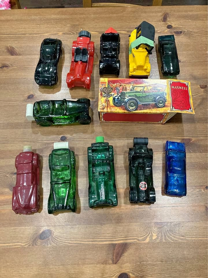 Rare collection of 11 vintage glass car-shaped bottles in assorted colors and styles. Includes red, green, black, yellow, blue, and clear glass pieces — some with original plastic caps, and one with its original Maxwell 23 decorative box. These novelty bottles were popular in the mid-20th century as collectible decanters, candy containers, and promotional items. 📦 What’s Included: • 11 vintage glass car bottles in assorted colors (green, red, black, blue, yellow, clear) • Various classic car shapes, roadsters, and racing cars • One original Maxwell 23 box included • Sizes range approx. 5”–7” long (see measuring tape in photos) 🪧 Condition: Mixed vintage condition. Most bottles are intact with no major chips or cracks. Some have original screw caps; one includes the original branded box. The ones below the box don’t have perfume or liquid in them. The other ones have some liquid in it. ✨ Perfect for collectors of vintage bottles, automobilia, man cave décor, or unique retro displays. Great starter lot for resale or display.