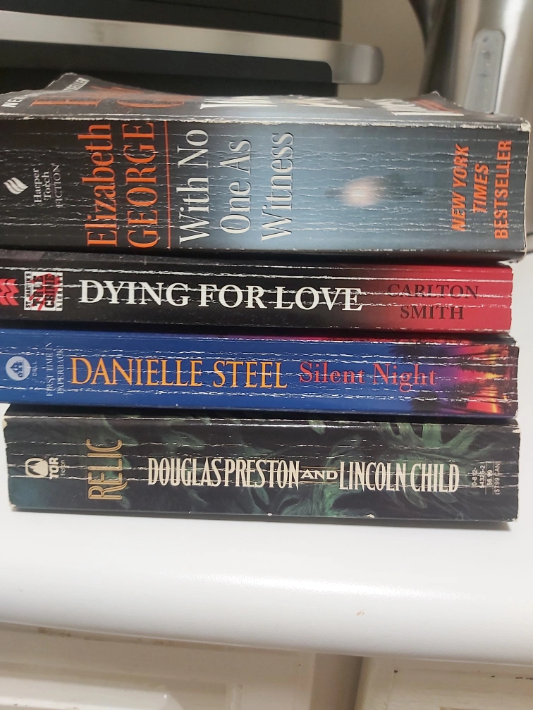 Selling a lot of four books! Includes: - Elizabeth George - With No One As Witness - Dying for Love by Carlton Smith - Danielle Steel - Silent Night - Relic by Douglas Preston and Lincoln Child