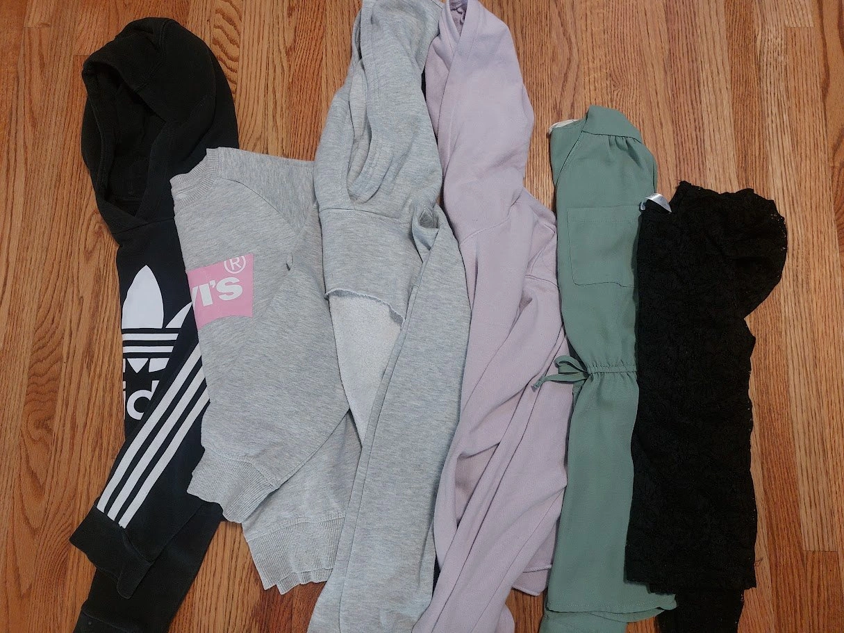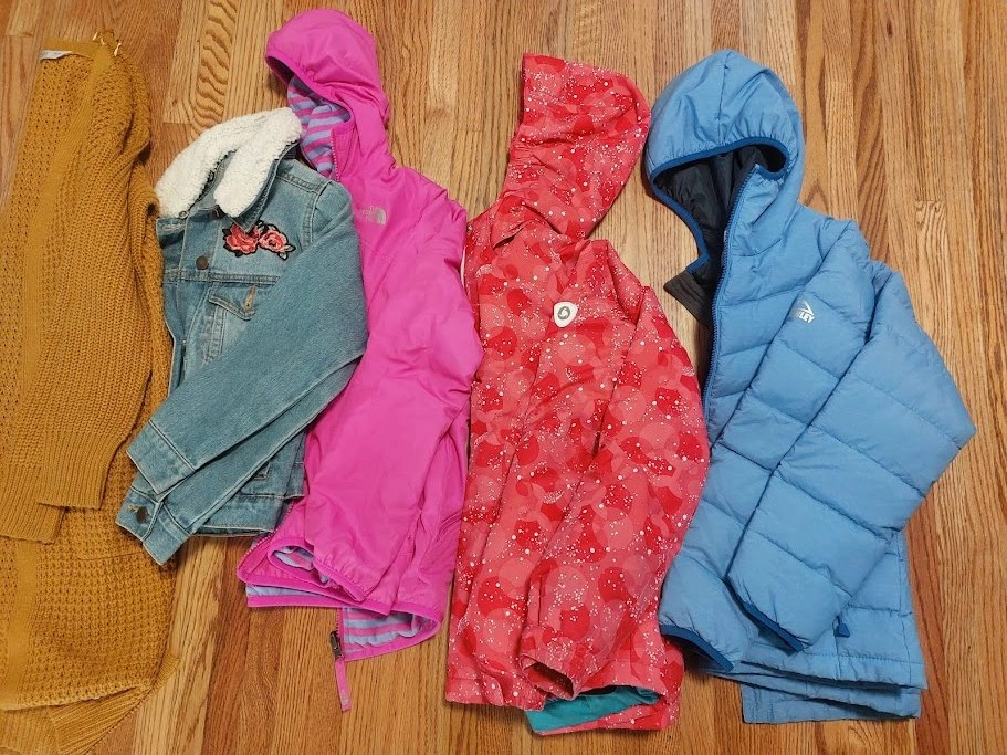 lot of clothes, Girls size Medium (10 to 12), 5 jackets, 10 bottoms, 6 tops.