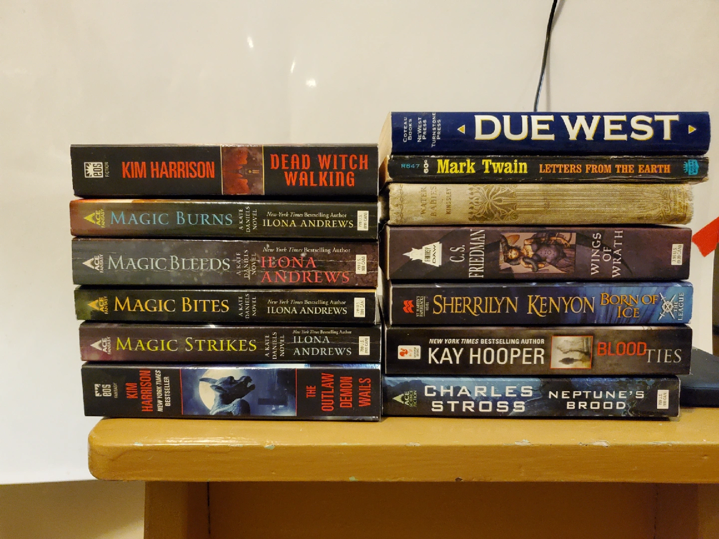 13 for $7 cash. Selling a collection of paperback books! Includes titles from Kim Harrison's "Dead Witch Walking" and several books from Ilona Andrews' "Kate Daniels" series such as "Magic Burns," "Magic Bleeds," "Magic Bites," and "Magic Strikes"! Also includes books by Mark Twain, Sherrilyn Kenyon, Kay Hooper, and Charles Stross