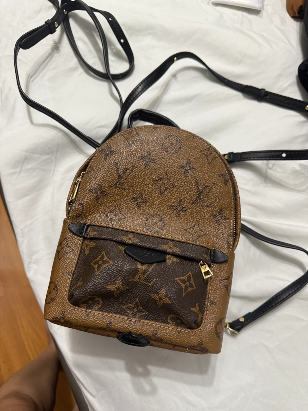 Selling a Louis Vuitton Palm Springs Mini backpack. It features the classic LV monogram pattern in brown. The bag is in good condition and perfect for everyday use or as a stylish accessory!
