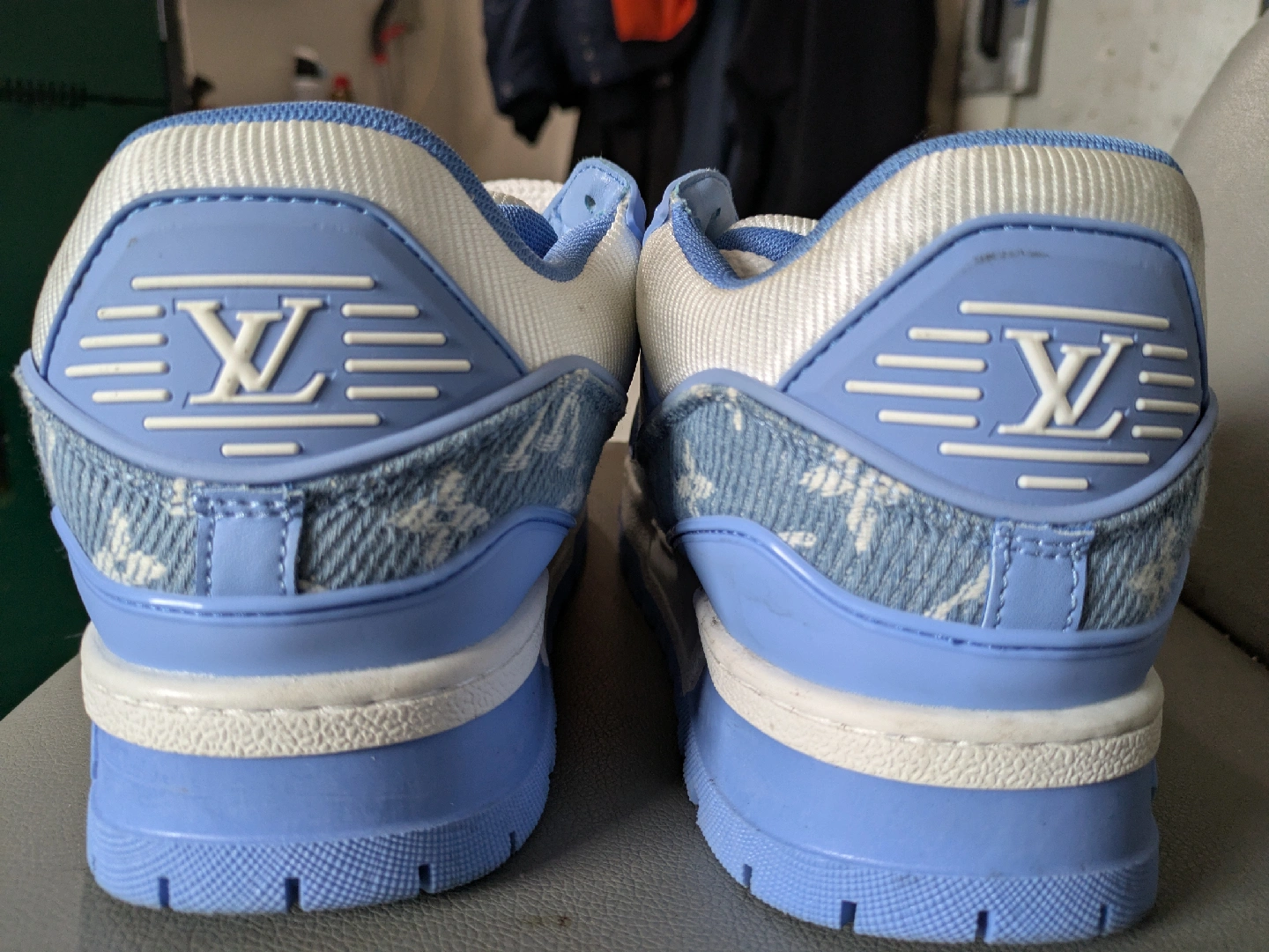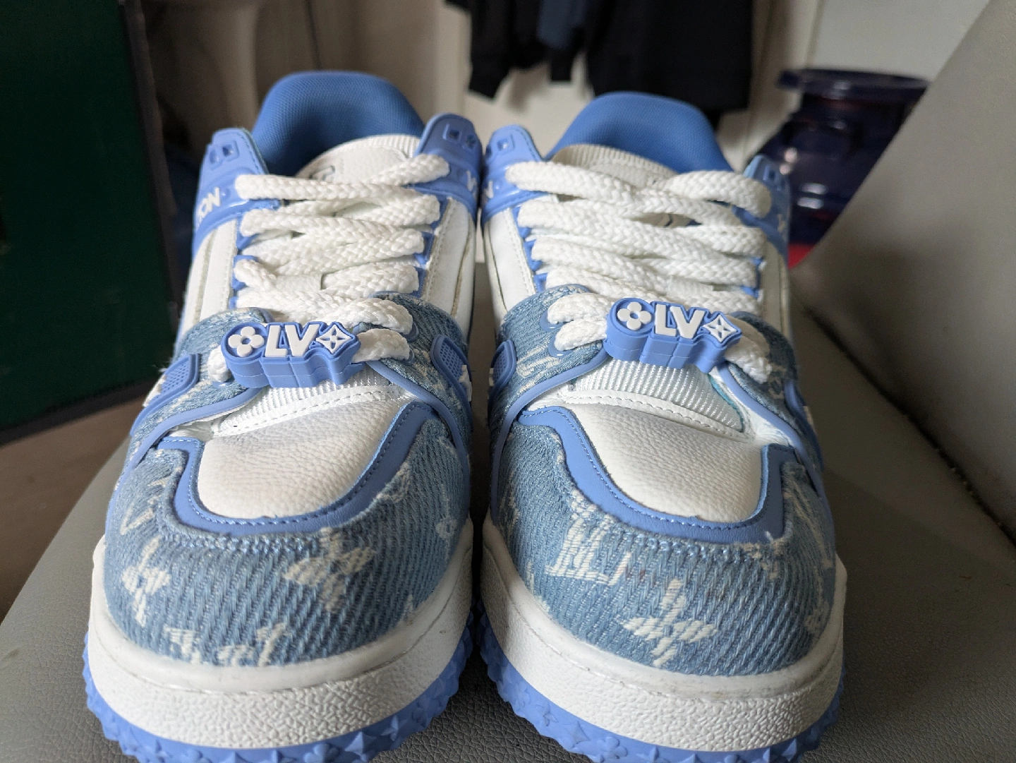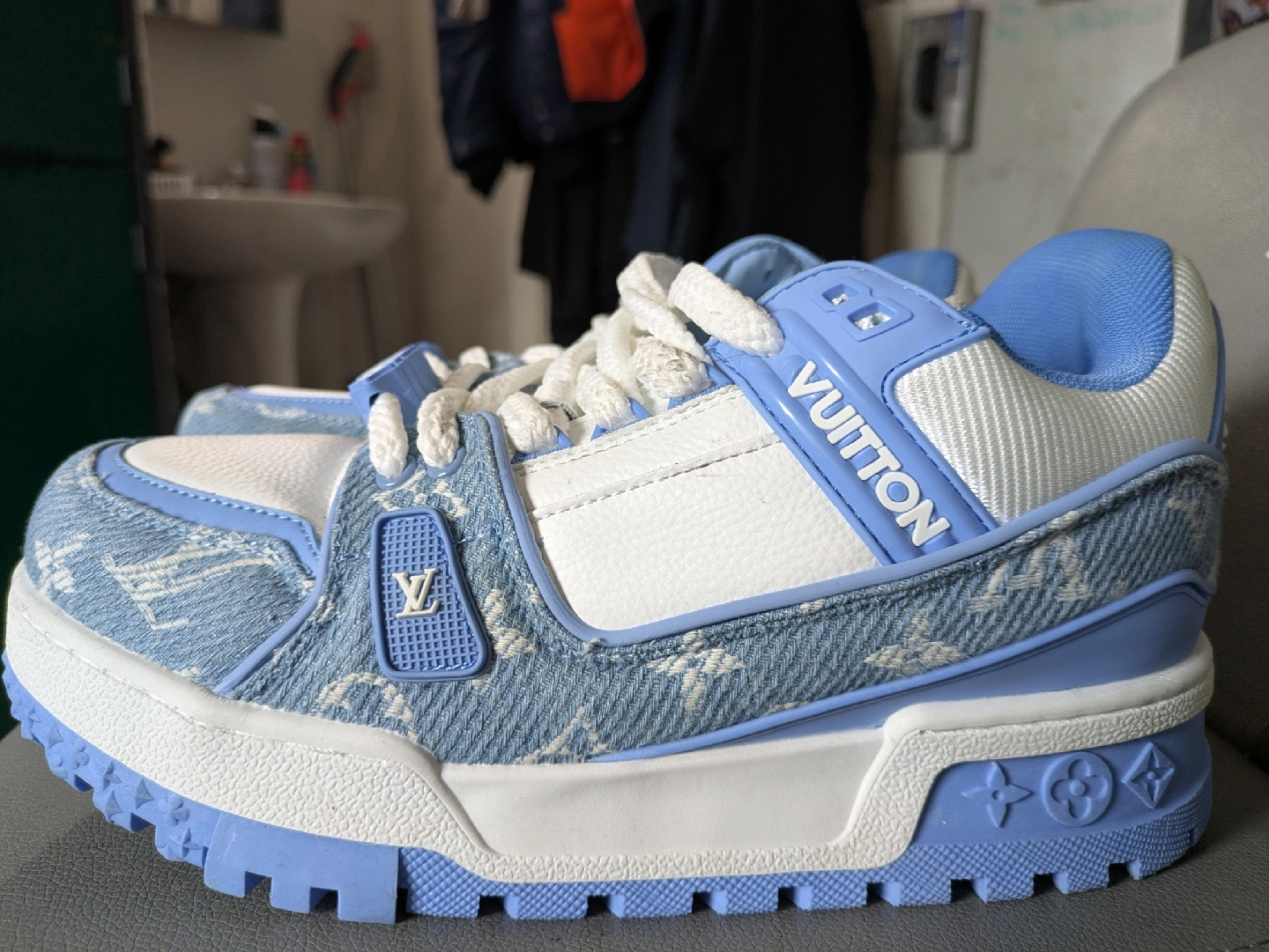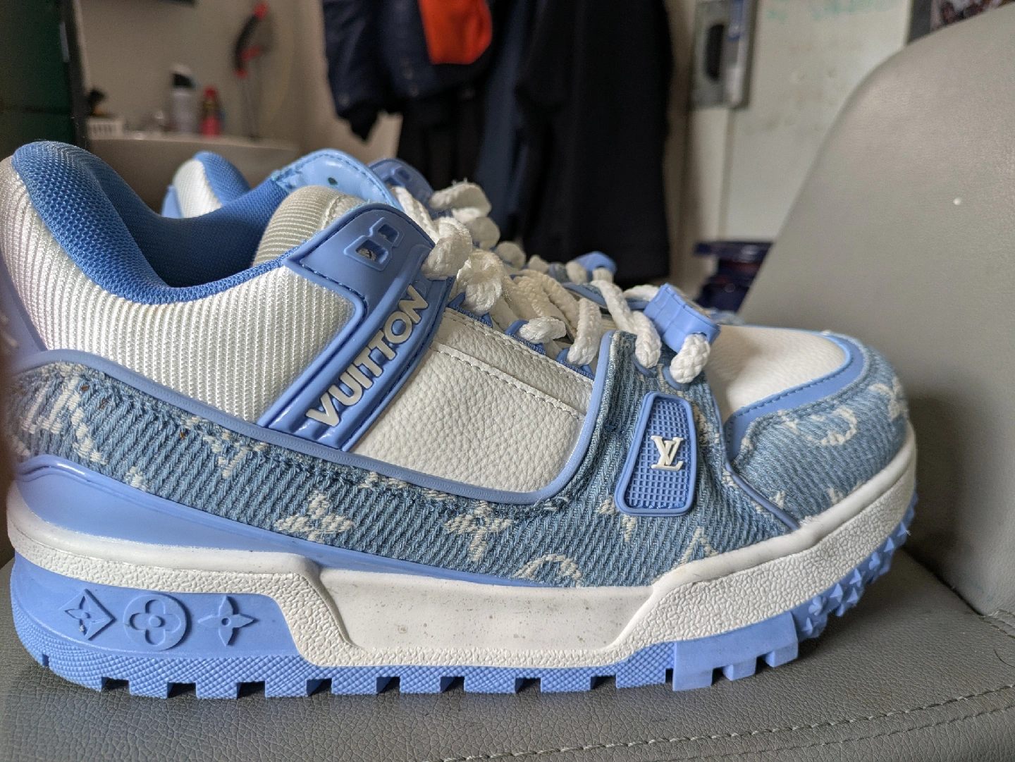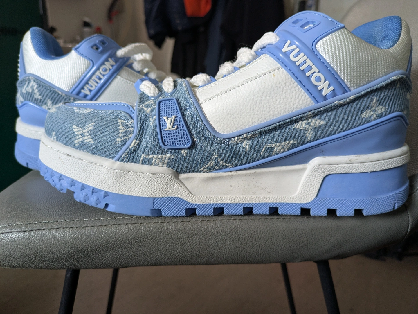 Selling a pair of Louis Vuitton Trainer sneakers in denim blue. These are in great condition and feature the iconic LV monogram pattern on the denim portions. The shoes have white leather accents and a light blue rubber sole. A stylish and eye-catching addition to any wardrobe!
