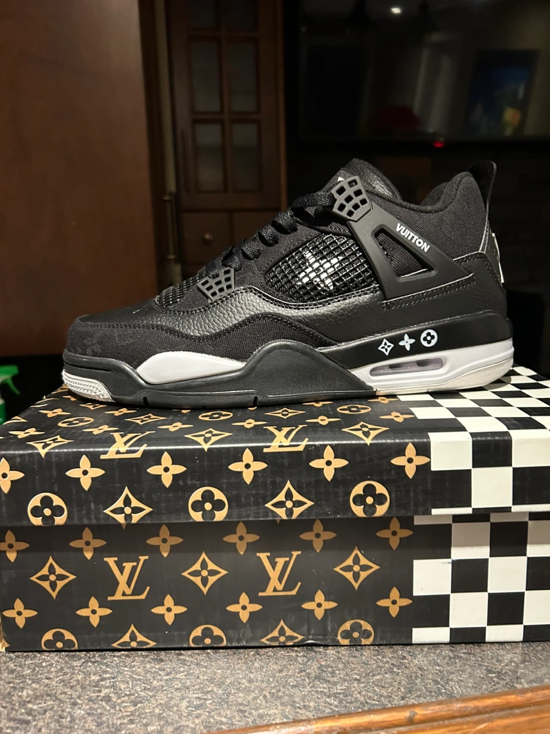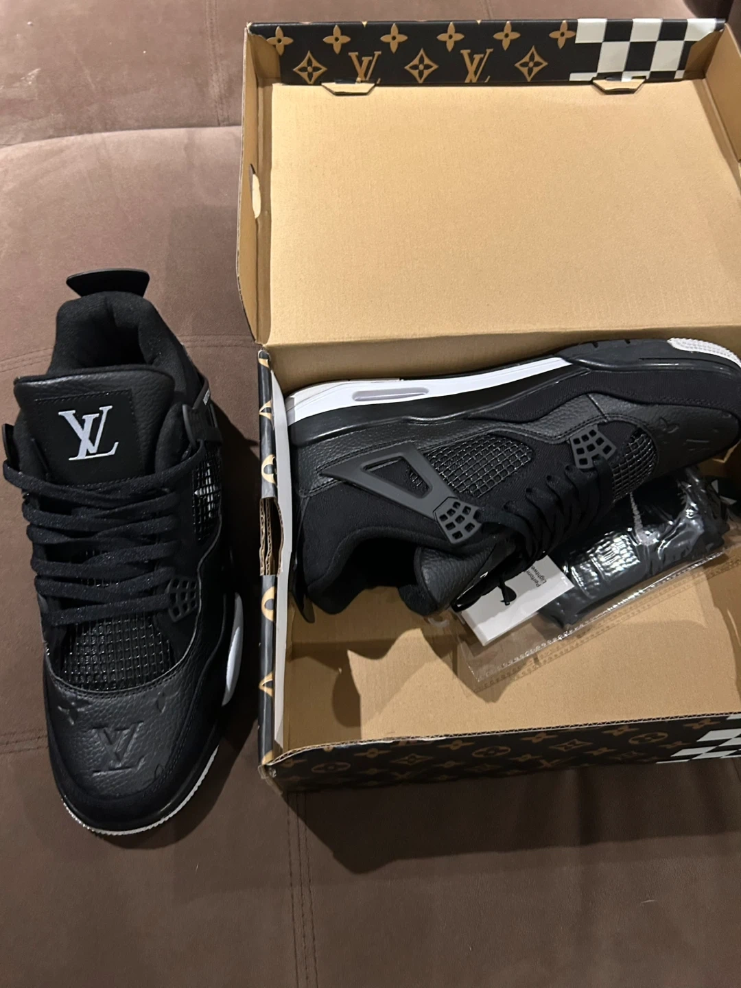 Selling a pair of Louis Vuitton x Air Jordan 4 sneakers in black. These come with the original box. Feel free to ask any questions!