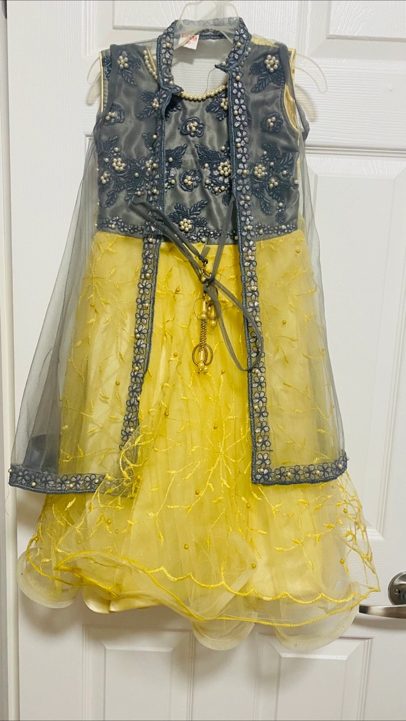 A beautiful yellow dress with a grey sleeveless jacket. The dress has embellishments and is made of tulle. Great for dressing up for a special event. Fit from 5 yrs to 7 yrs