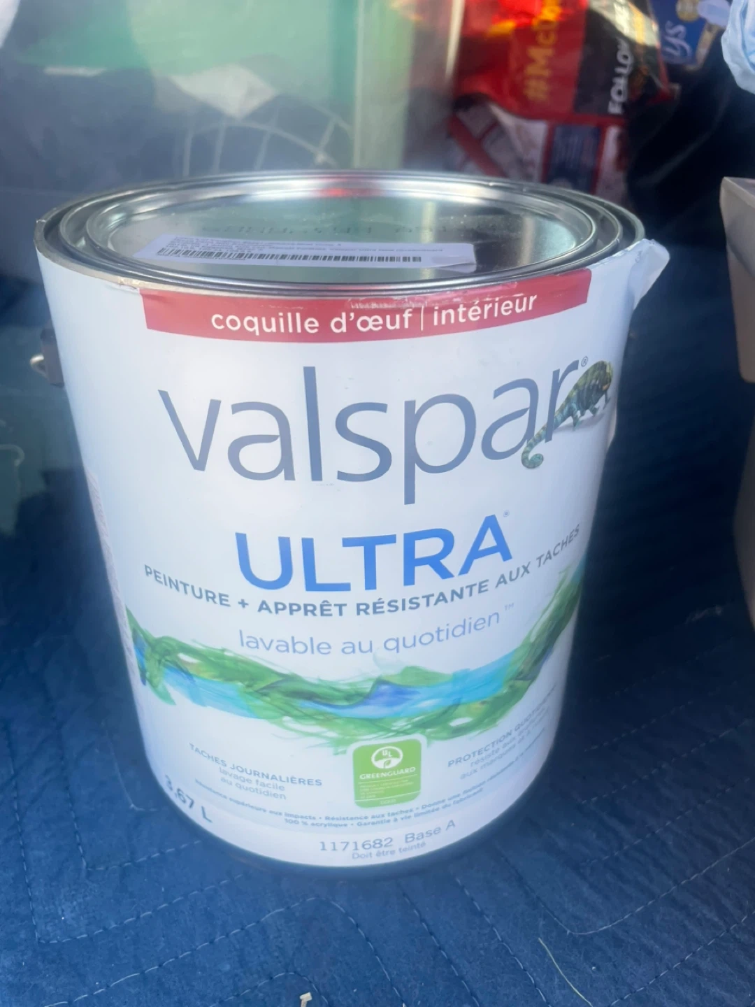 Selling 1 gallon of Valspar Ultra interior paint in eggshell finish - grey. Great for any room in your home! The label mentions it's stain-resistant and washable. Purchased from Lowes