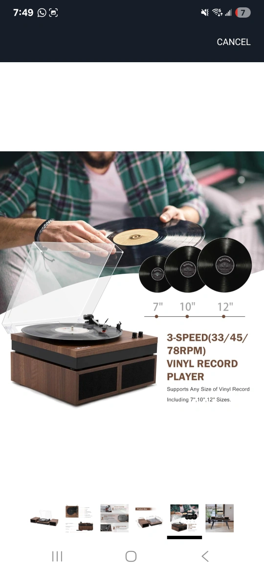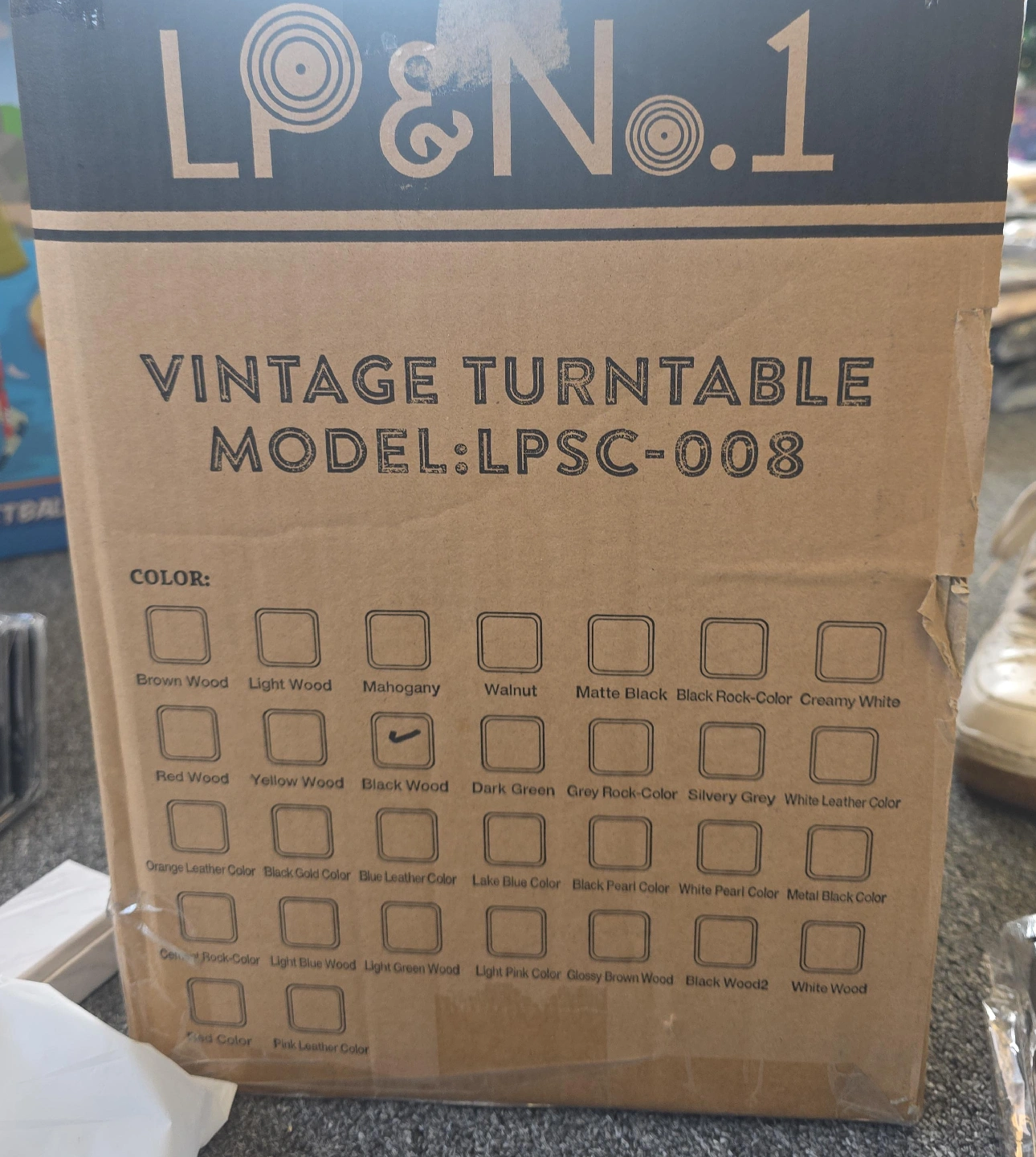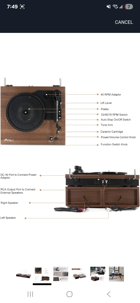 Enjoy your favourite vinyl records with this LP&No.1 record player! It features a 3-speed turntable (33/45/78 RPM) and built-in speakers for easy listening. It supports any size of vinyl record, including 7", 10", and 12" sizes. The unit includes a 45 RPM adapter, lift lever, auto stop on/off switch, tone arm, ceramic cartridge, and power/volume control knob. It also has RCA output ports to connect external speakers colour black wood