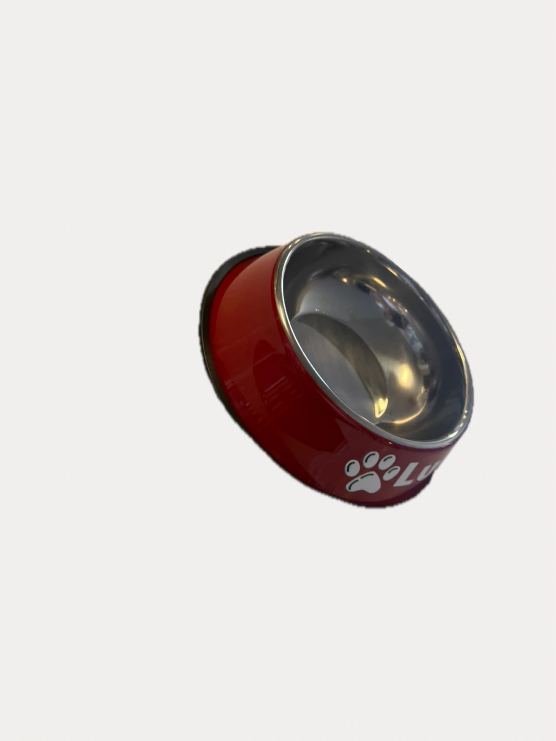Selling a cute red dog bowl with 'Lucky' printed on the side! It's in great condition and ready for a new furry friend