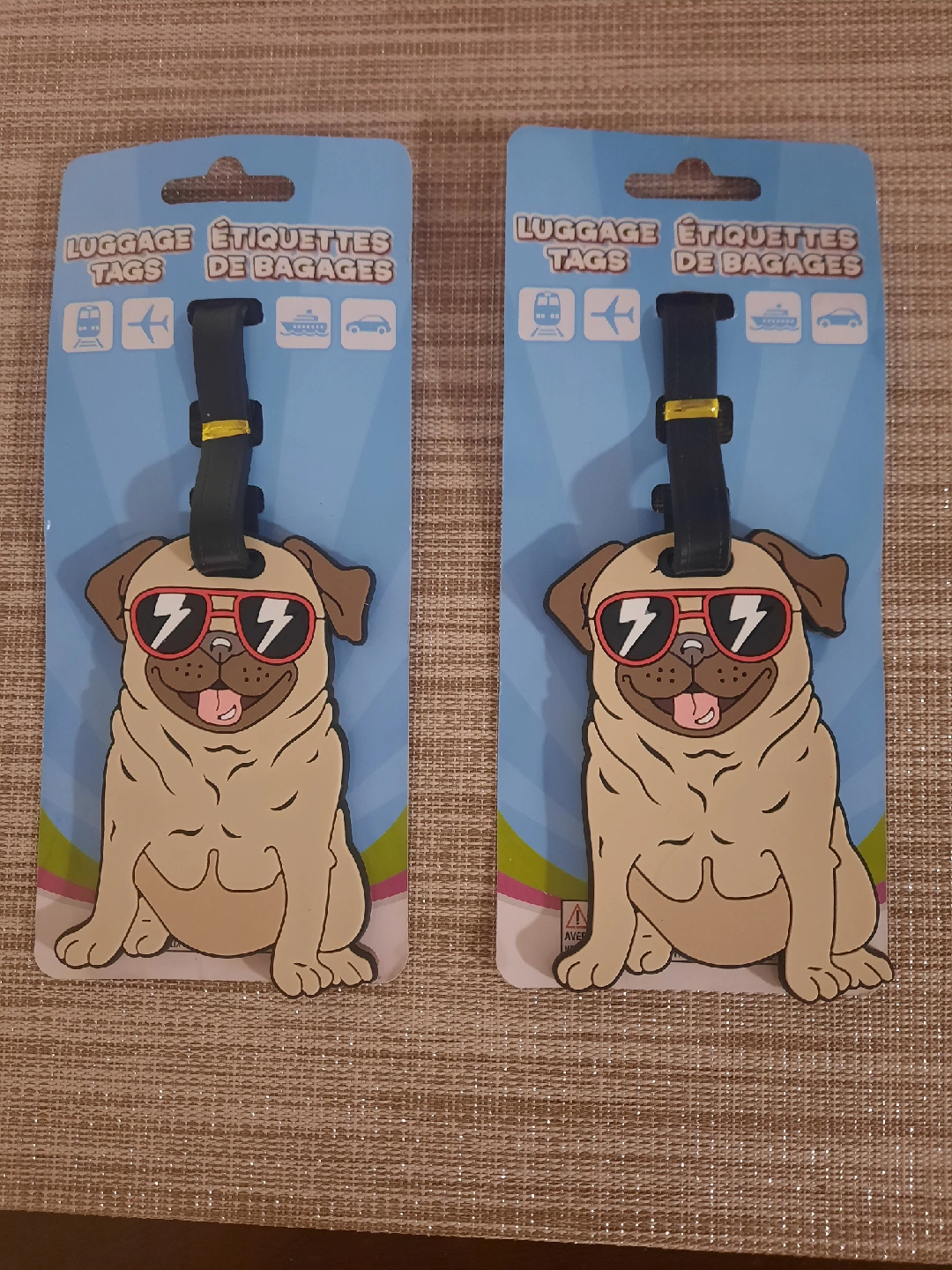 Two luggage tags featuring a pug wearing sunglasses! They're brand new and ready to help you spot your bag on the carousel