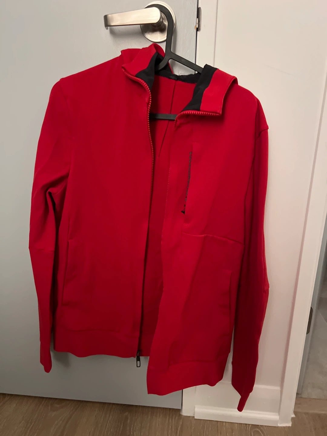 Selling a red Lululemon jacket! It's in great condition and perfect for layering. The Lululemon logo is visible on the sleeve. It's a stylish and functional piece for workouts or everyday wear