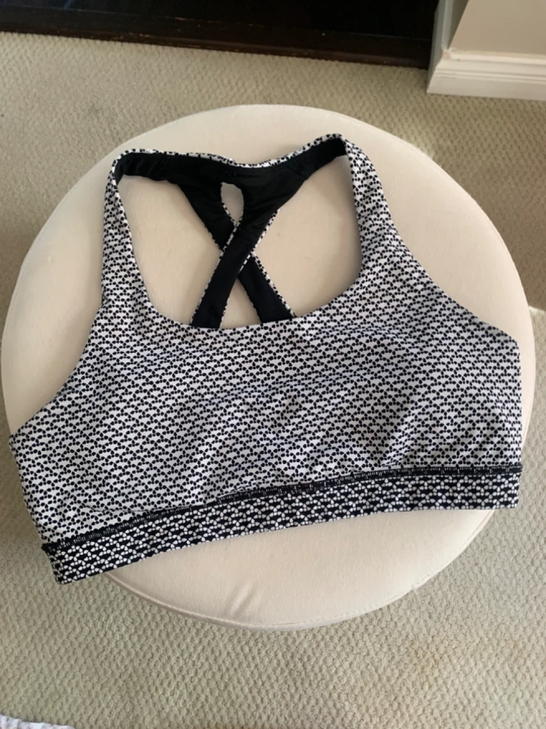 Selling a Lululemon sports bra in size 12. It features a black and white pattern and a criss-cross back design. Great for workouts or everyday wear!