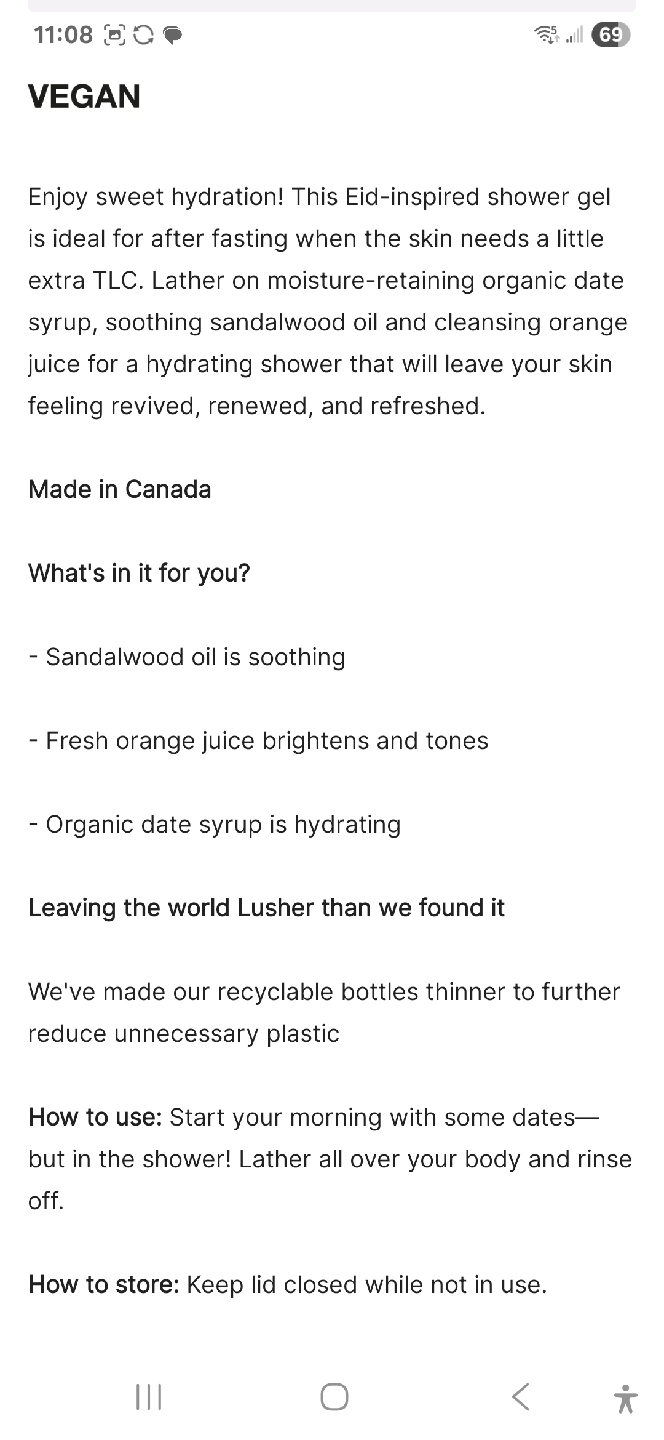 Enjoy sweet hydration with Lush's Sticky Dates shower gel! This Eid-inspired shower gel is ideal for after fasting when the skin needs a little extra TLC. Lather on moisture-retaining organic date syrup, soothing sandalwood oil and cleansing orange juice for a hydrating shower that will leave your skin feeling revived, renewed, and refreshed. - Sandalwood oil is soothing - Fresh orange juice brightens and tones - Organic date syrup is hydrating Size: 500ml Retails $42