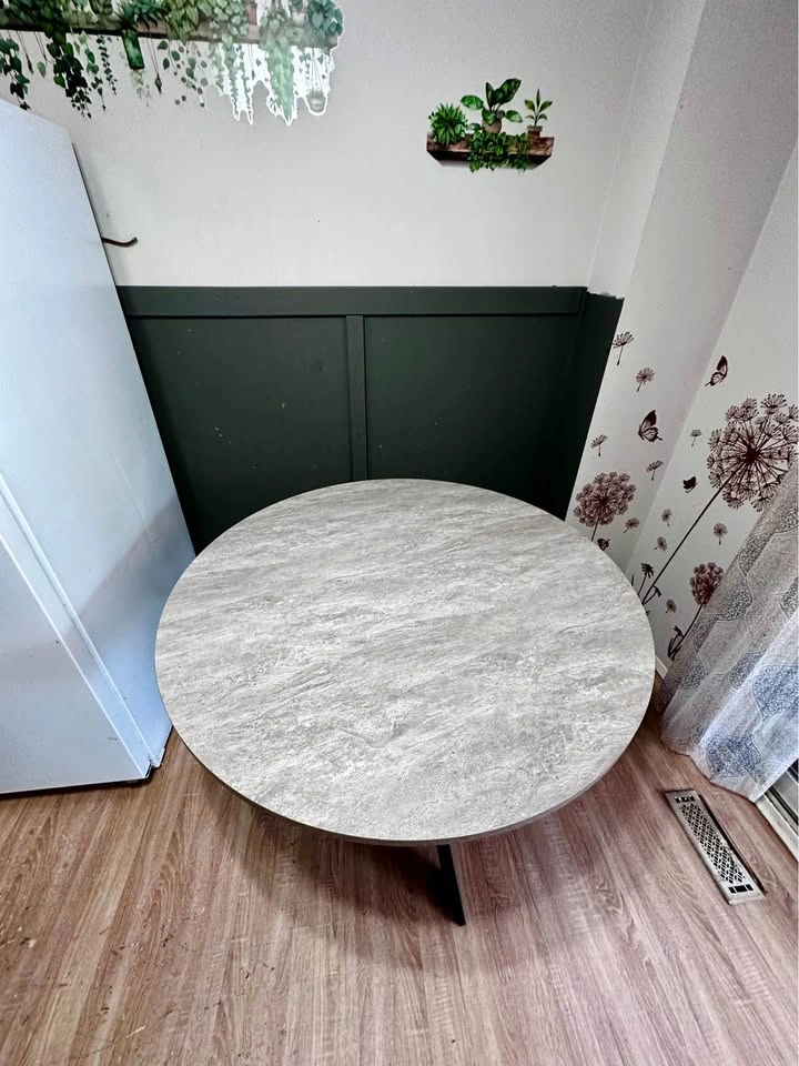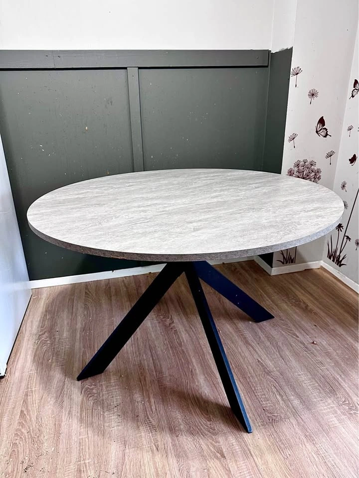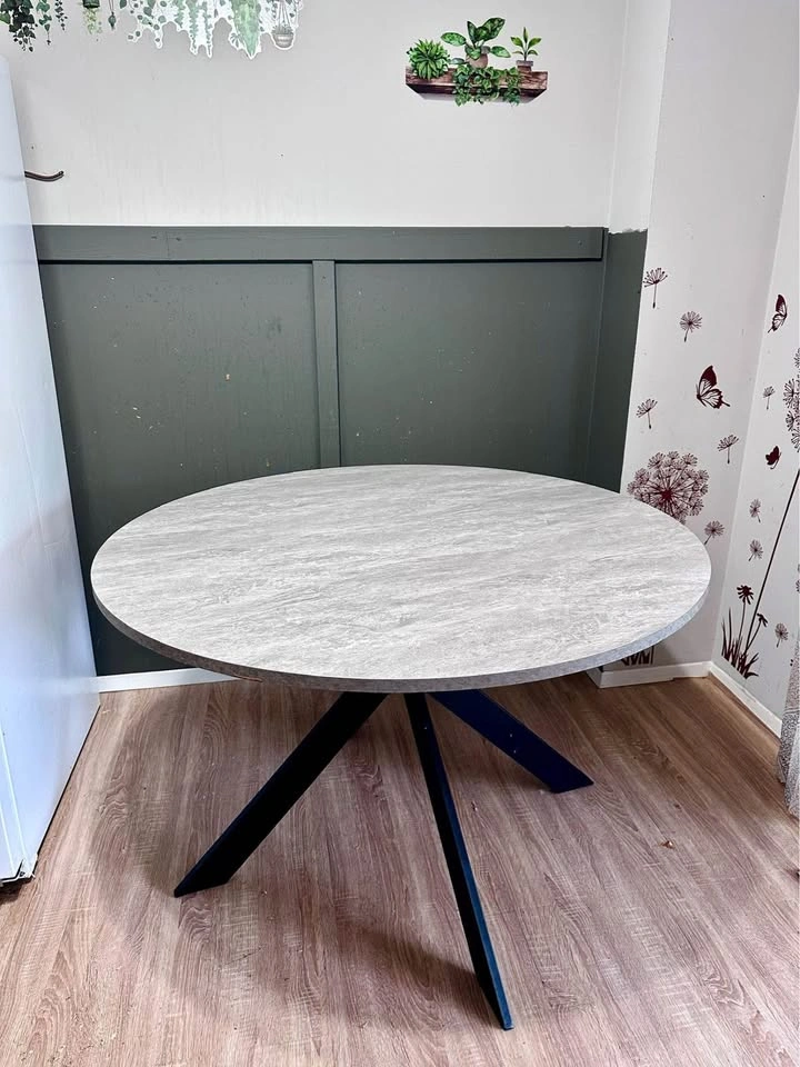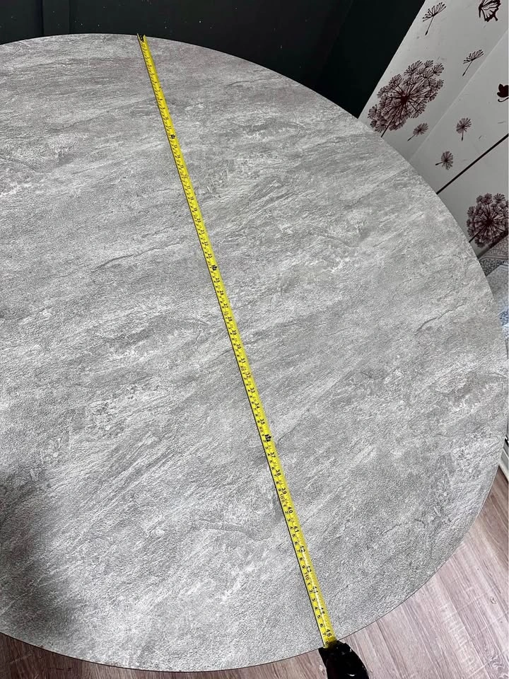 It’s beautiful dinner table, we purchased it for $950, unfortunately it doesn’t fit to our place. It’s too big! 47inch =1.194 meters 120cm circle, just like said it’s brand new, it’s dismantled ready to move. It’s not small! 6 people easily comfortably can fit, 8 is possible as well. It’s strong material,it’s not a cheap light stuff.