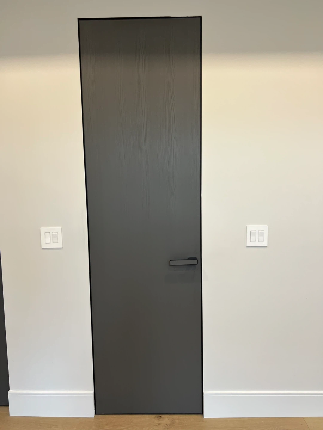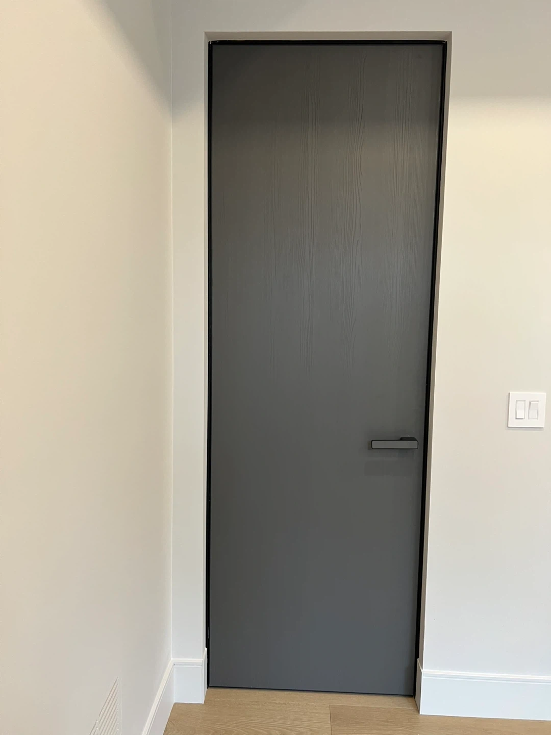 1 single doors 34" by 106” tall right hand in. Sound proof, suitable for home theatre. Dark grey smooth panel finish, infilling Aluminum Honey Comb, Matt black frame included, leaf thickness 1 3/4", door frame thickness 1 3/4", front side - no casing , back side 2 3/8" casing, flush invisible. 4 hidden hinges per door included. Pick up only at Green Lane and Leslie.