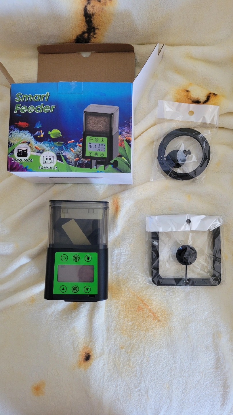 Selling a Lychee automatic fish feeder for aquariums! It comes with a timer and is USB rechargeable. It's designed to be moisture-proof, self-feeding for pelleted food, and includes 2 floating rings and a charger cable.