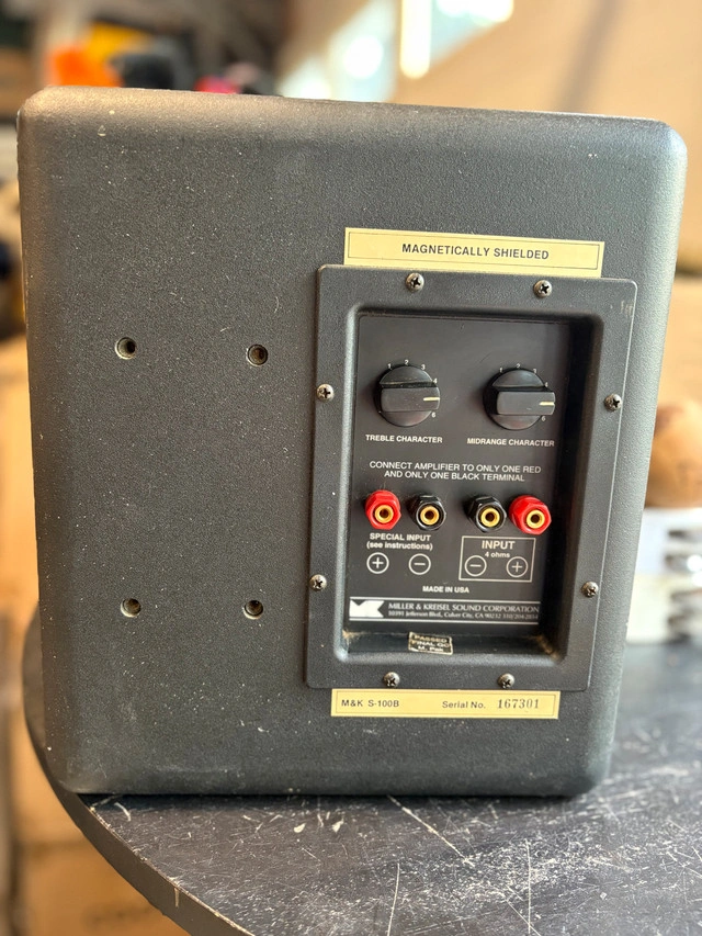 Selling a used M&K S-100B speaker, known for its high-quality audio and robust build. Magnetically shielded to prevent interference with other devices. This speaker delivers crisp and clear sound, perfect for home theatre or music enthusiasts. Specifications: * Brand: Miller & Kreisel (M&K) * Model: S-100B * Type: Bookshelf Speaker * Shielding: Magnetically Shielded * Made in USA If the ad is up, it's available!