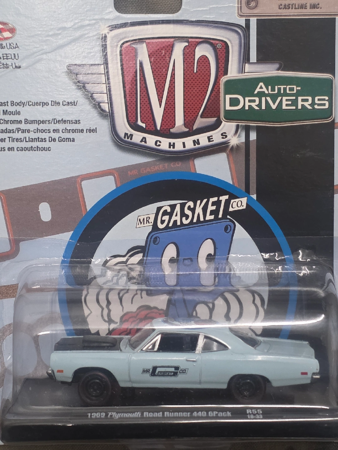 Selling an M2 Machines 1969 Plymouth Road Runner 440 6Pack diecast car. It's part of the Auto-Drivers series and features Mr. Gasket Co. livery. A great addition to any collection!