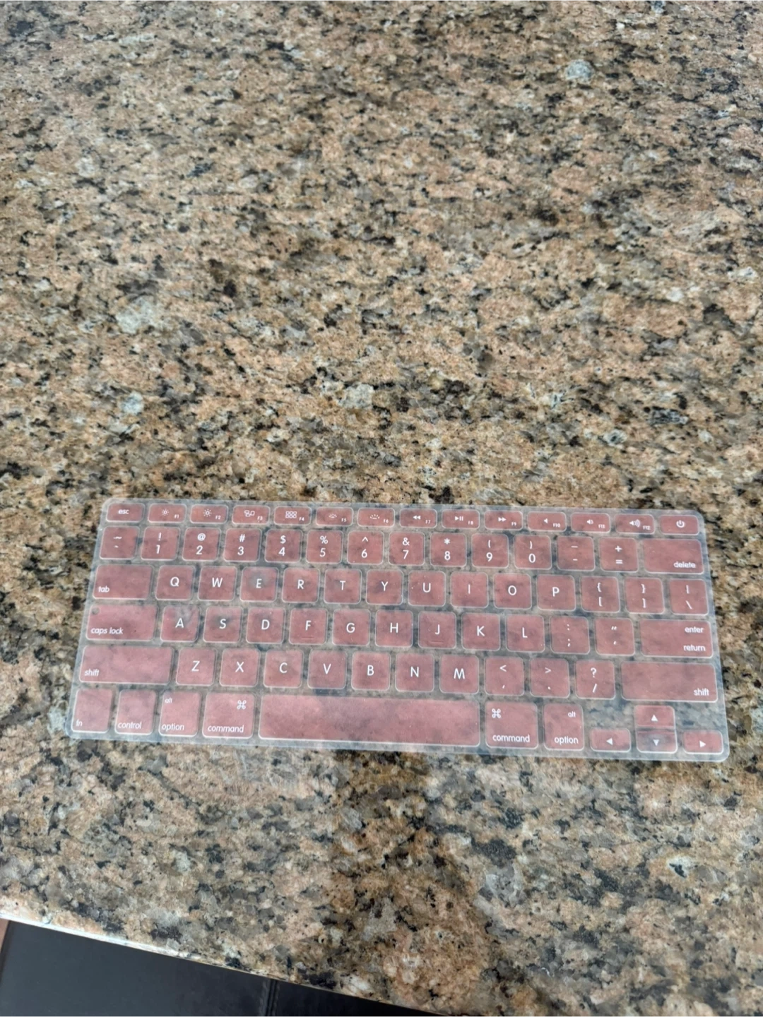 Selling a used keyboard cover for a MacBook. It has a clear design with a red/pink tint to it. It is in used condition.