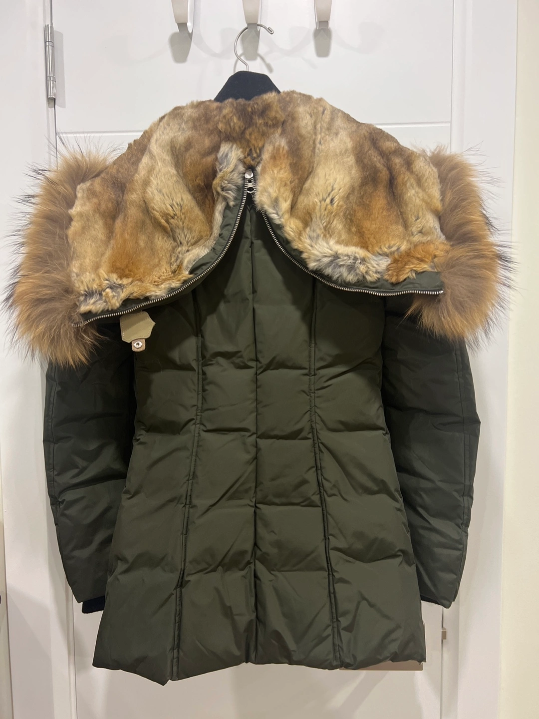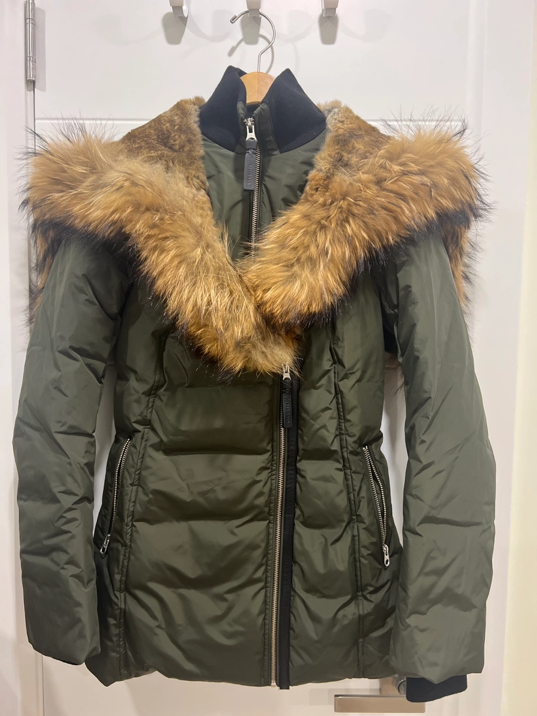 Stay warm this winter with this stylish Mackage down coat in a lovely olive green! It features a fur-trimmed hood and a flattering silhouette. Perfect for braving the Canadian cold