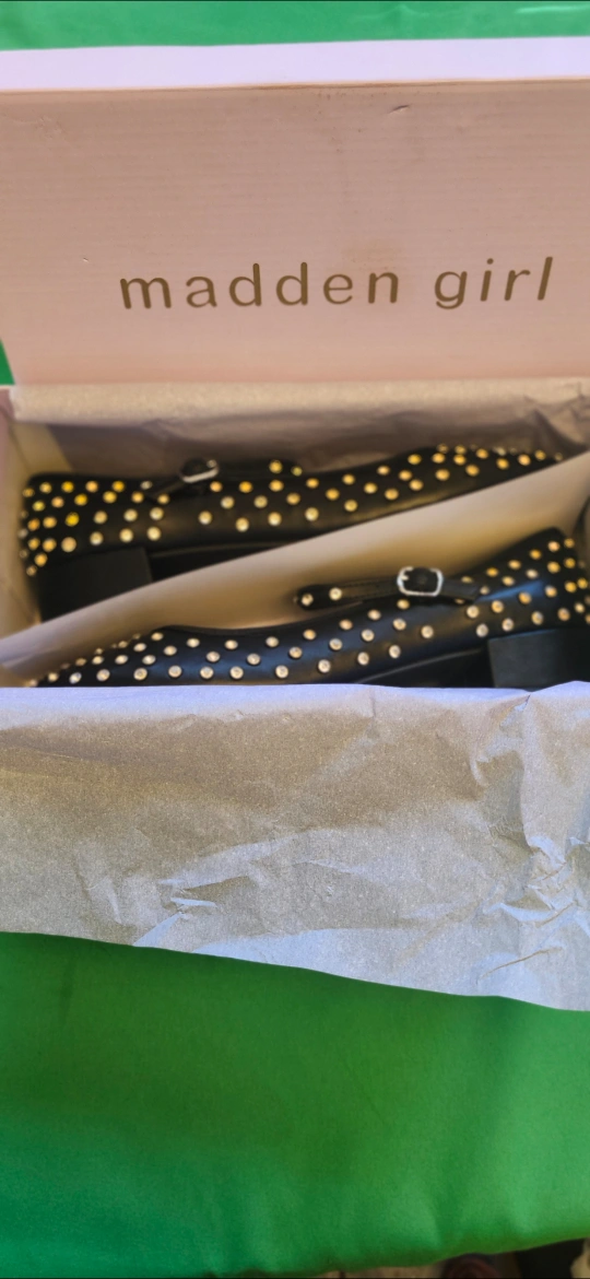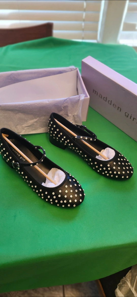 These Madden Girl Mary Jane flats are brand new and ready for a new home! They're a size 10 and come in their original box. The black colour and studded design make them a stylish choice for any outfit