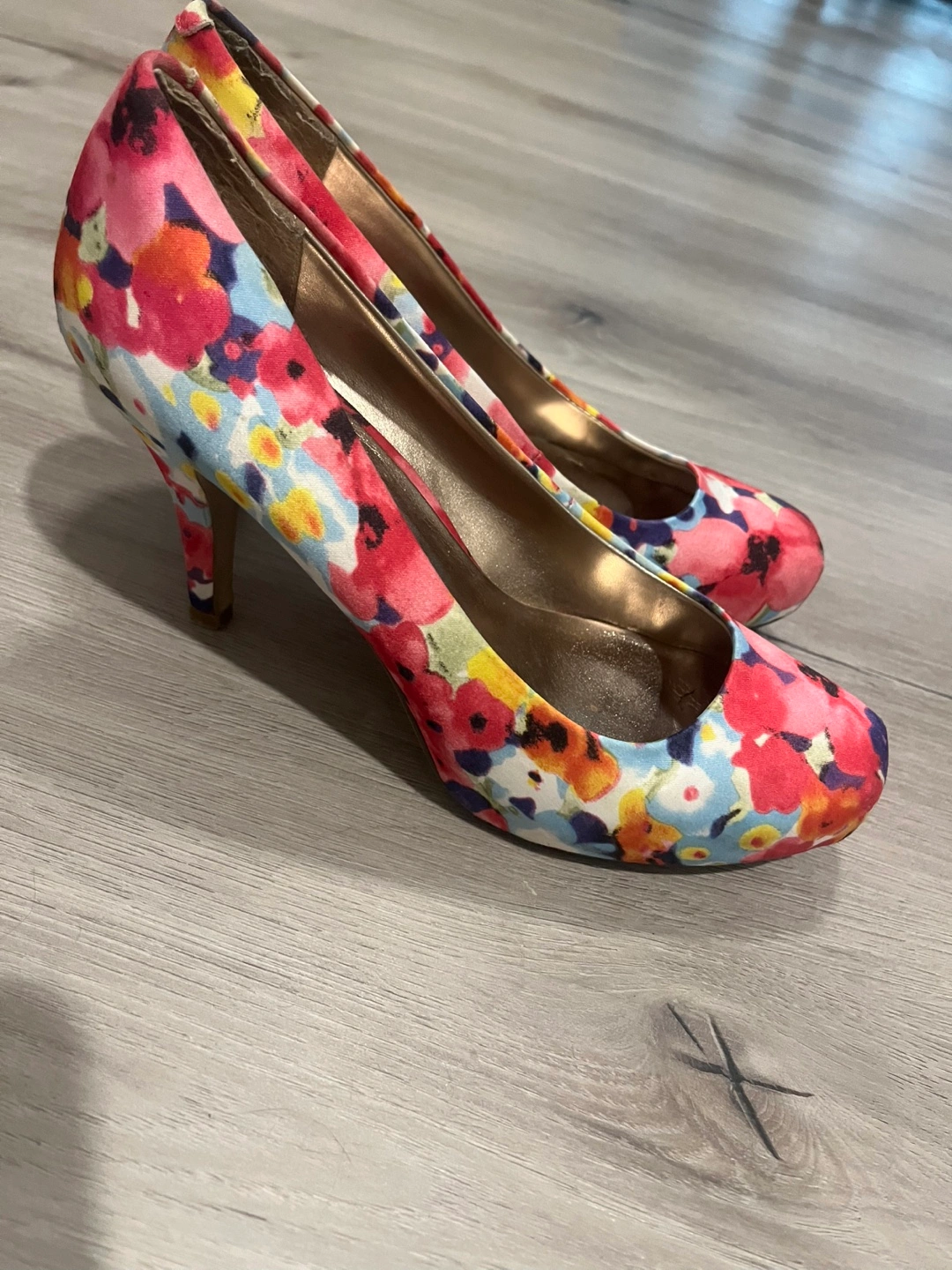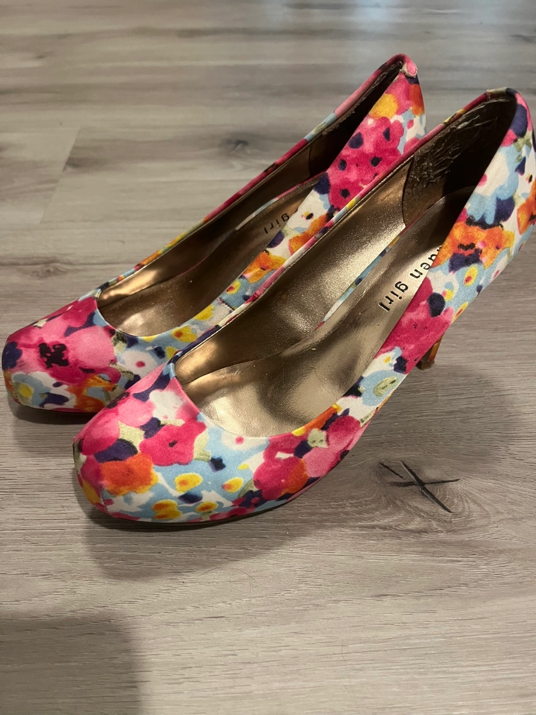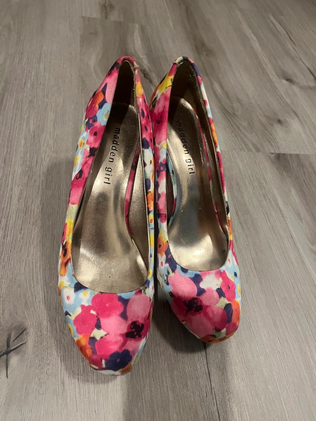 Cute Madden Girl heels with a fun floral pattern! They're a size 8 and in great shape for adding a pop of colour to your outfit