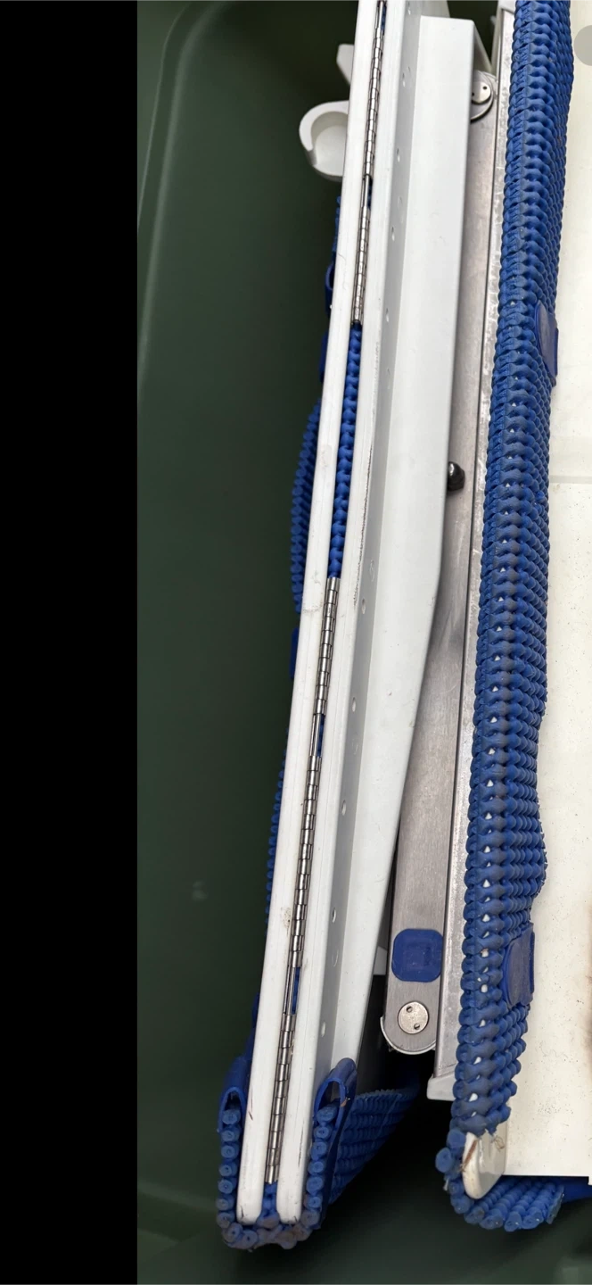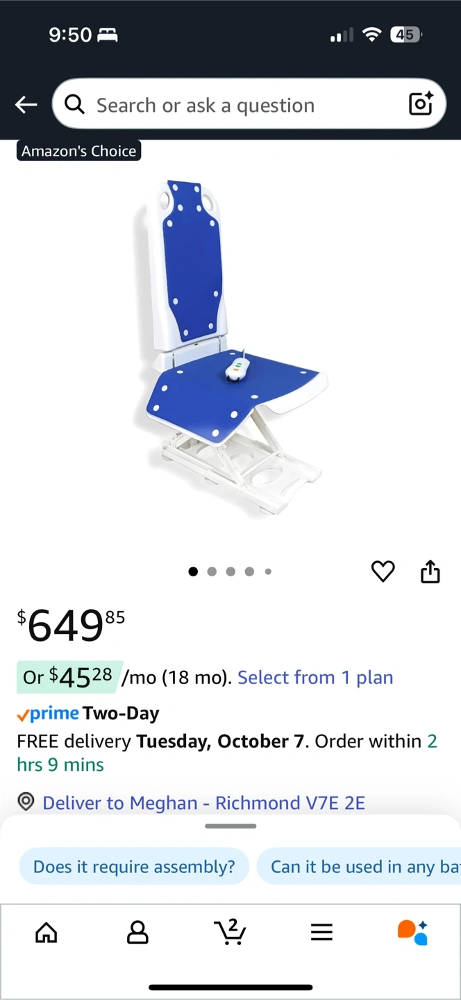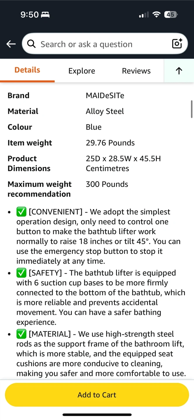 bathtub lift chair in blue. It's made of alloy steel and can support a maximum weight of 300 pounds. The dimensions are 25D x 28.5W x 45.5H centimetres. It features a simple one-button operation to raise 18 inches or tilt 45 degrees. It also has an emergency stop button. The bathtub lifter is equipped with 6 suction cup bases for more reliable and safer bathing Pu 2 and steveston.