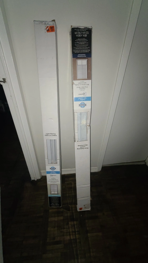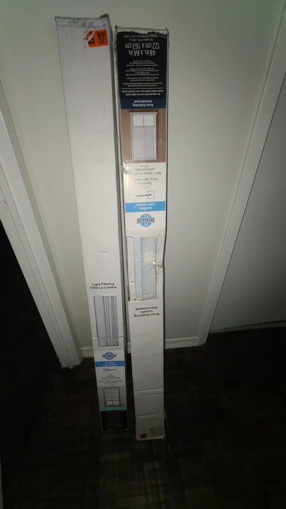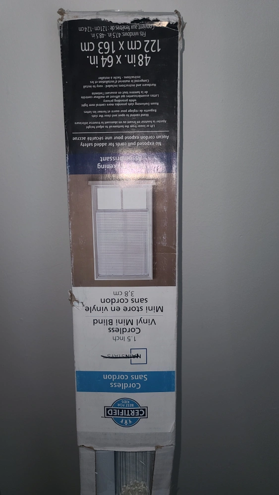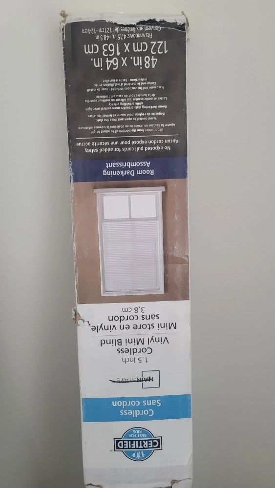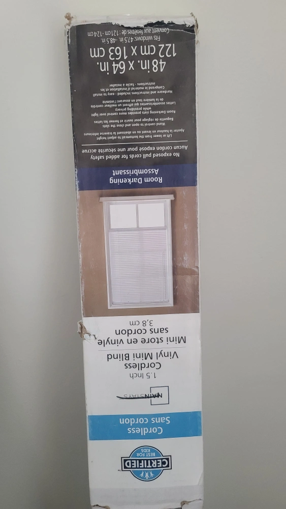 Selling a Mainstays cordless vinyl mini blind. It's a room darkening blind, measuring 48 inches by 64 inches. It fits windows 47.5 in - 48.5 in. Hardware and instructions are included, making it easy to install!