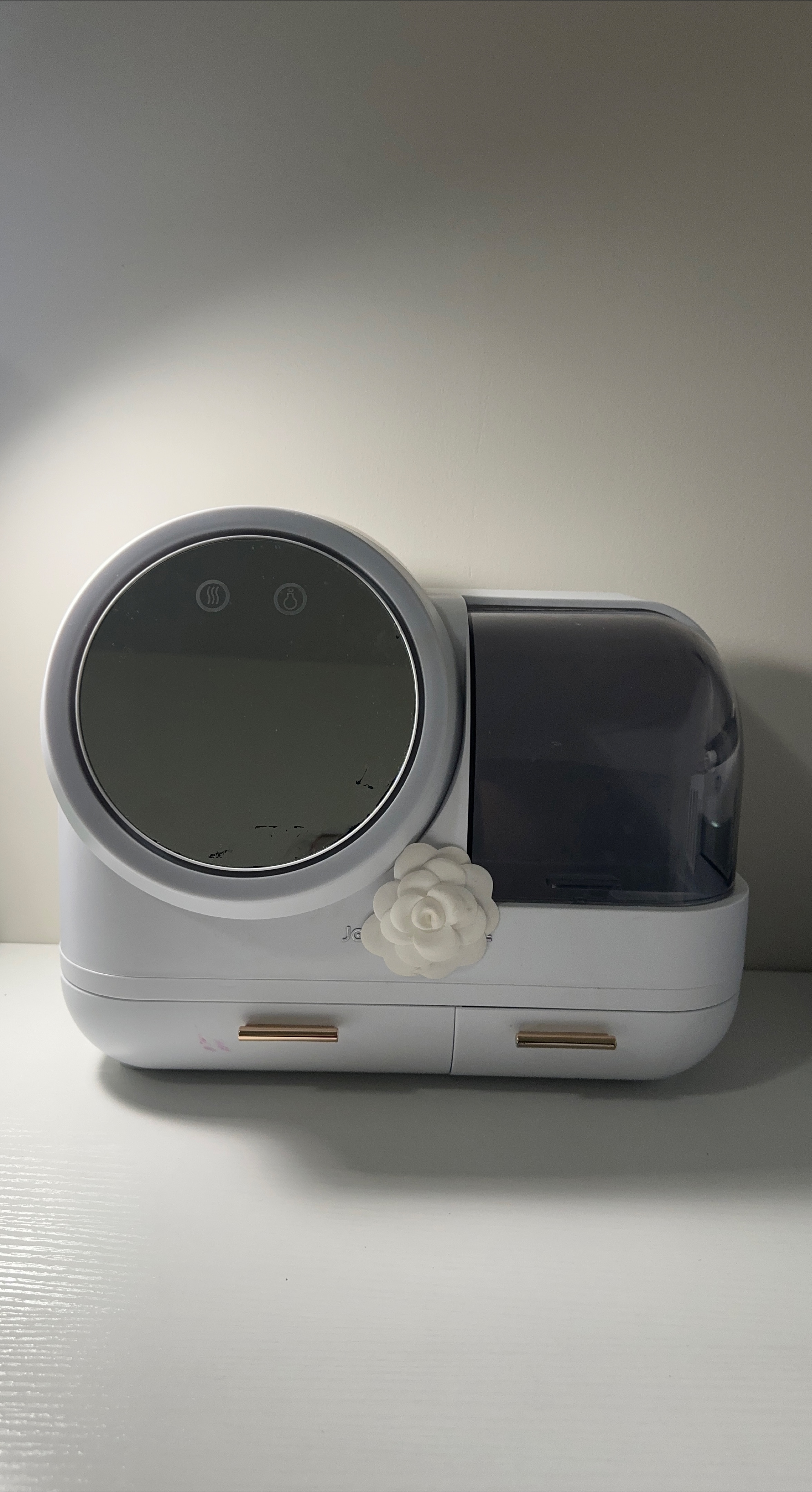 Here's a handy makeup organizer with a built-in mirror! It has a spot for everything, from brushes to palettes. It's in great condition and ready to keep your vanity tidy